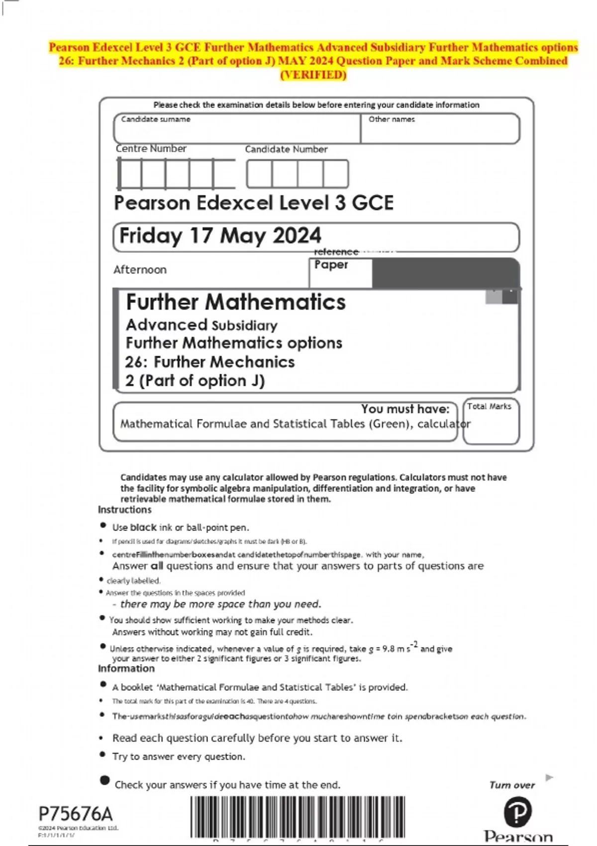 2024 pearson edexcel level 3 gce further mathemati