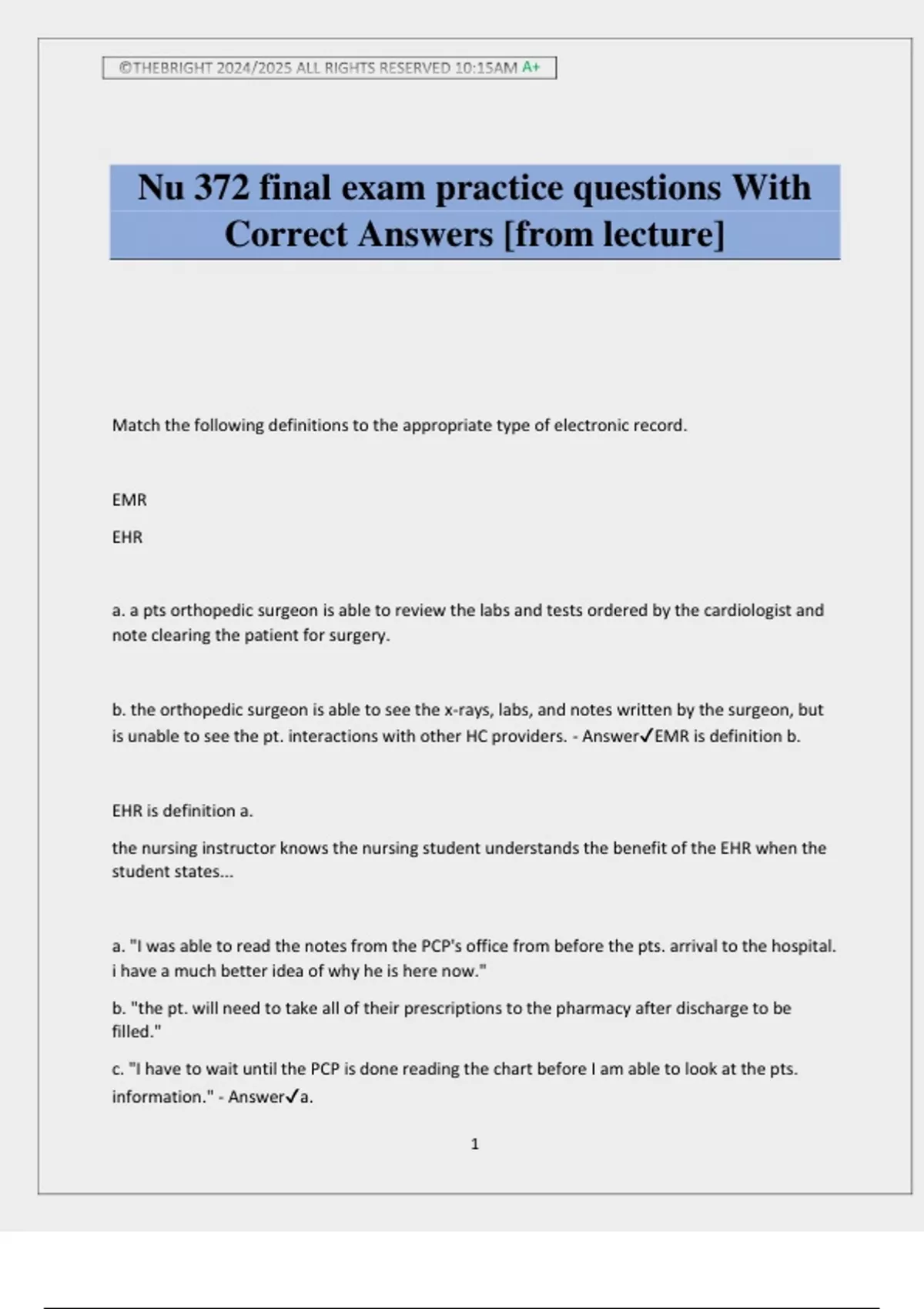 Nu 372 final exam practice questions With