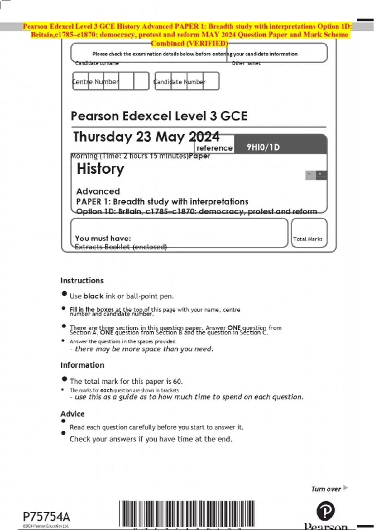 2024 Pearson Edexcel Level 3 GCE History Advanced PAPER 1: Breadth study with interpretations Option 1D: Britain,c1785–c1870: democracy, protest and reform MAY Question Paper and Mark Scheme MERGED