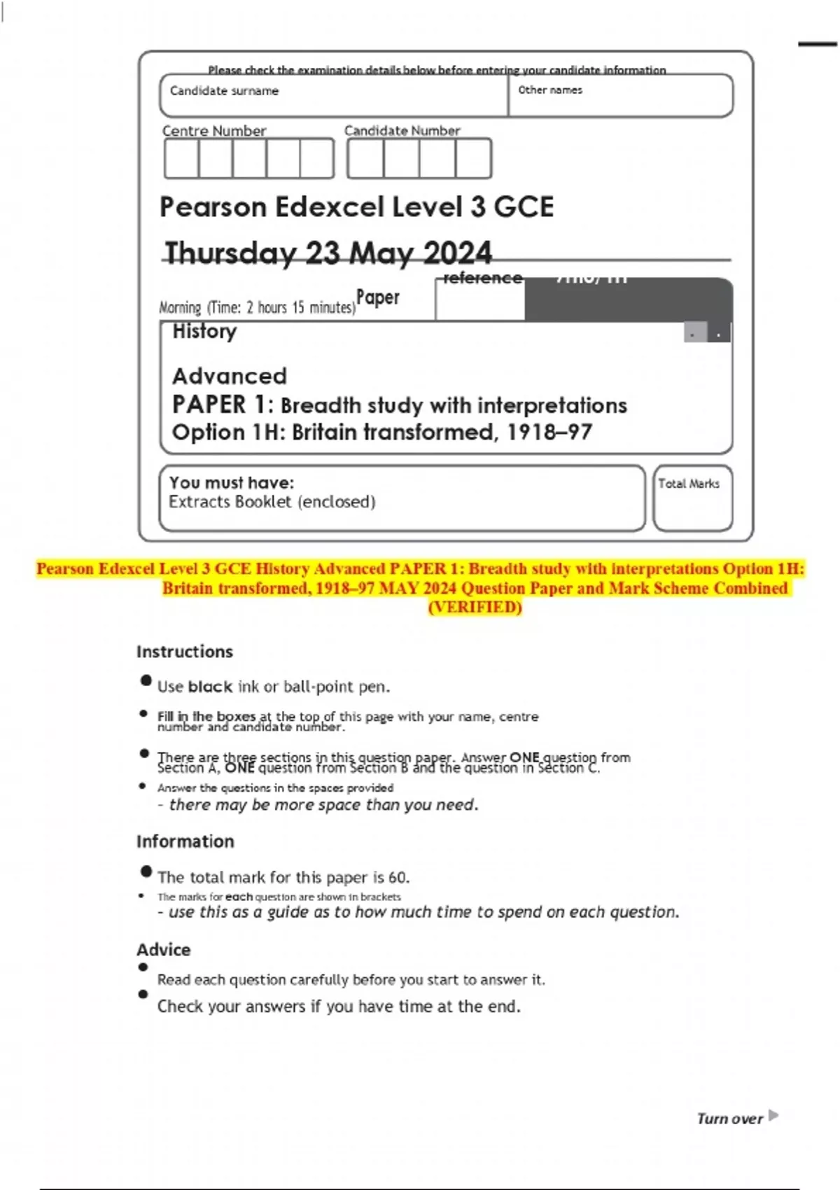 2024 Pearson Edexcel Level 3 GCE History Advanced PAPER 1: Breadth study with interpretations Option 1H: Britain transformed, 1918–97 MAY Question Paper and Mark Scheme MERGED
