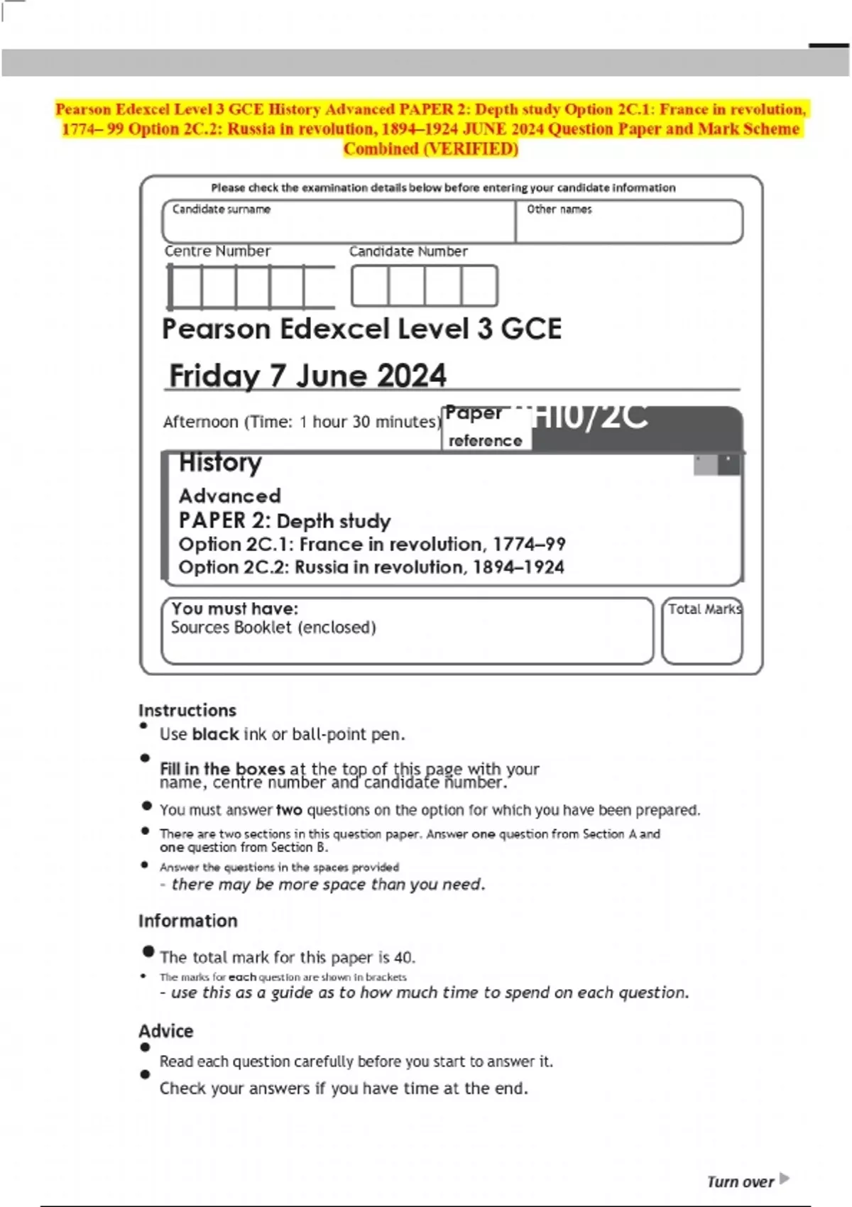 2024 Pearson Edexcel Level 3 GCE History Advanced PAPER 2: Depth study Option 2C.1: France in revolution, 1774– 99 Option 2C.2: Russia in revolution, 1894–1924 JUNE Question Paper and Mark Scheme MERGED