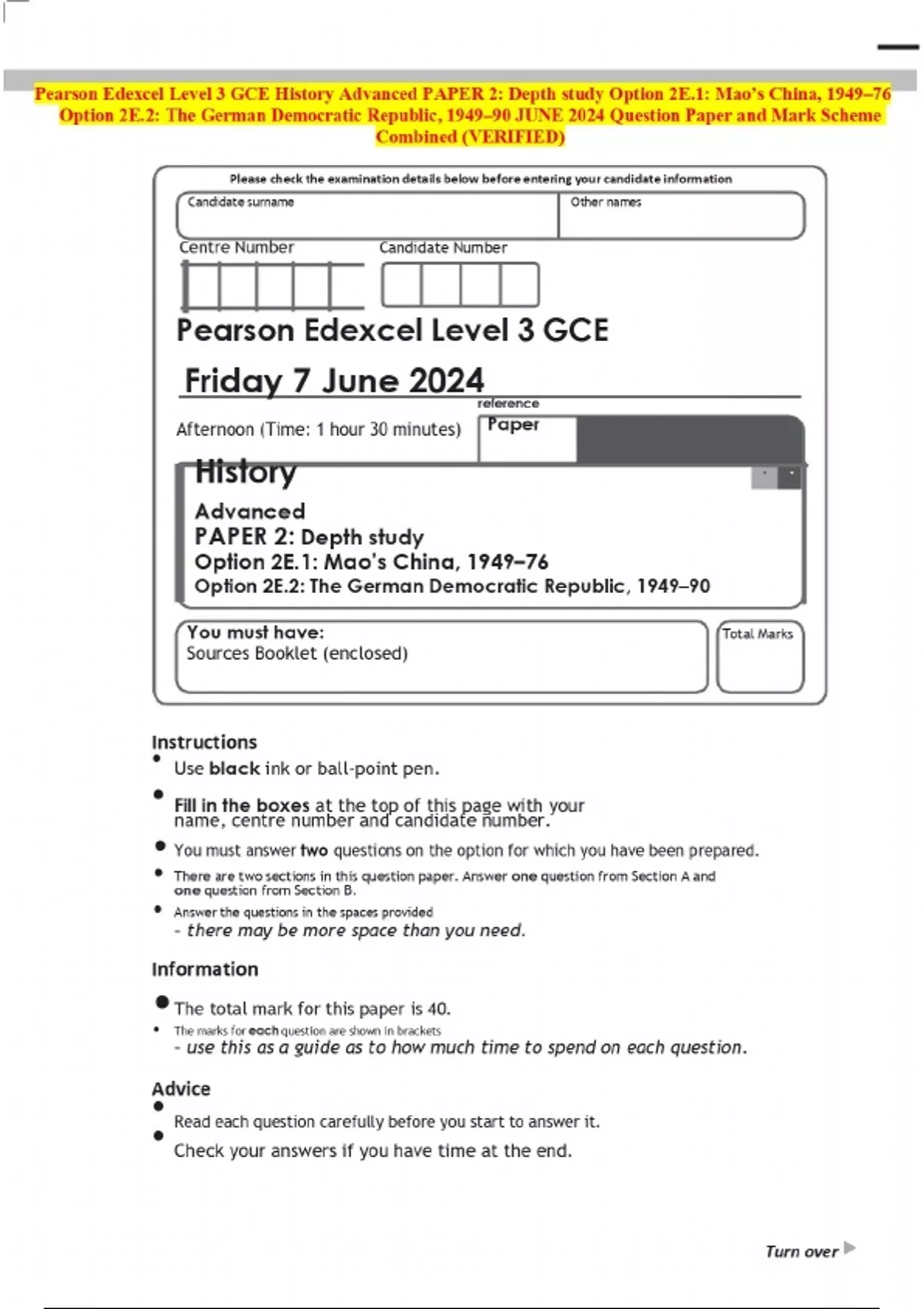 2024 Pearson Edexcel Level 3 GCE History Advanced PAPER 2: Depth study Option 2E.1: Mao’s China, 1949–76 Option 2E.2: The German Democratic Republic, 1949–90 JUNE Question Paper and Mark Scheme MERGED