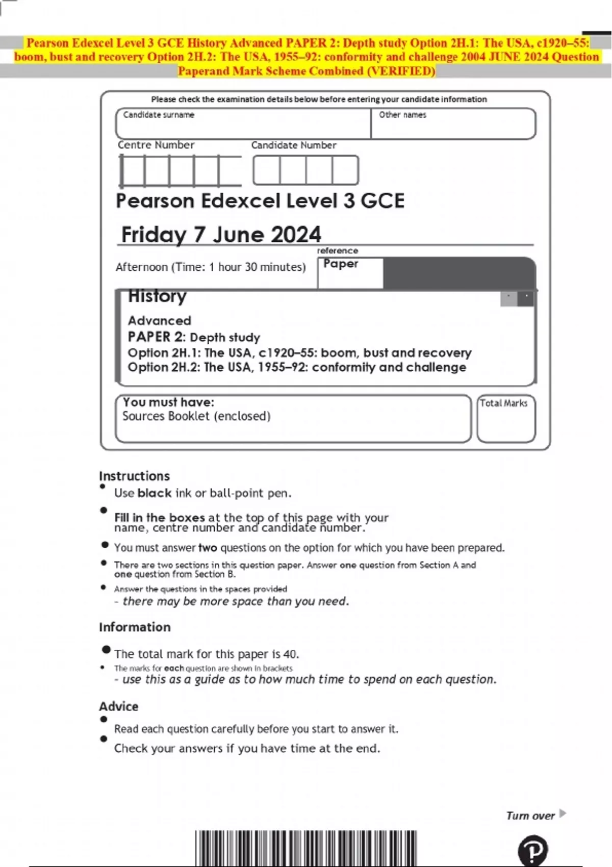 2024 Pearson Edexcel Level 3 GCE History Advanced PAPER 2: Depth study Option 2H.1: The USA, c1920–55: boom, bust and recovery Option 2H.2: The USA, 1955–92: conformity and challenge 2004 JUNE Question Paper and Mark Scheme MERGED