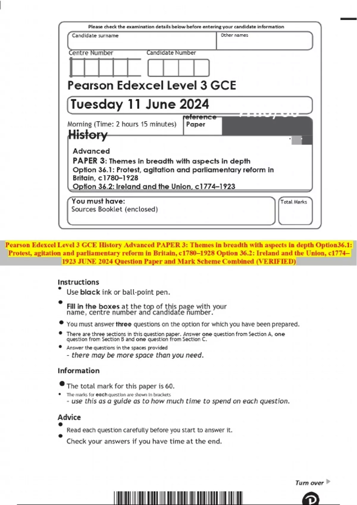 2024 Pearson Edexcel Level 3 GCE History Advanced PAPER 3: Themes in breadth with aspects in depth Option 36.1: Protest, agitation and parliamentary reform in Britain, c1780–1928 Option 36.2: Ireland and the Union, c1774– 1923 JUNE Question Paper and Mark