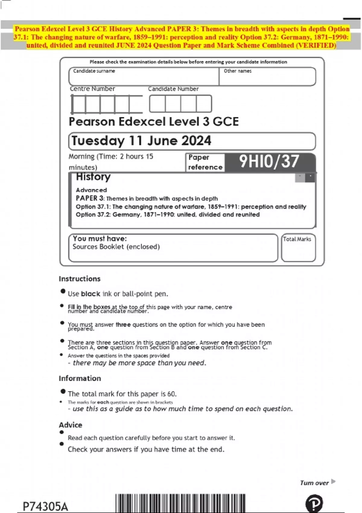 2024 Pearson Edexcel Level 3 GCE History Advanced PAPER 3: Themes in breadth with aspects in depth Option 37.1: The changing nature of warfare, 1859–1991: perception and reality Option 37.2: Germany, 1871–1990: united, divided and reunited JUNE Question P