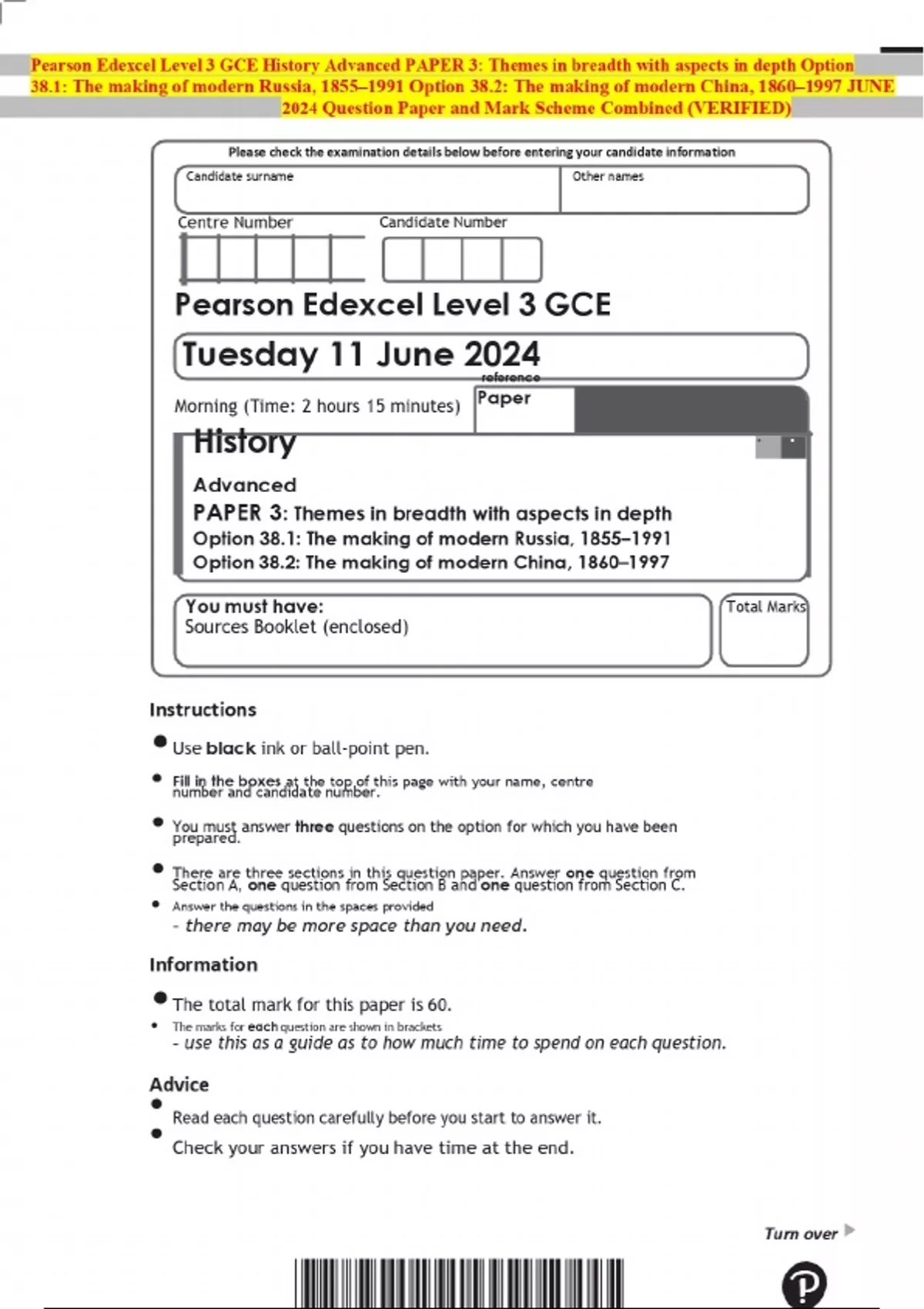 2024 Pearson Edexcel Level 3 GCE History Advanced PAPER 3: Themes in breadth with aspects in depth Option 38.1: The making of modern Russia, 1855–1991 Option 38.2: The making of modern China, 1860–1997 JUNE Question Paper and Mark Scheme MERGED
