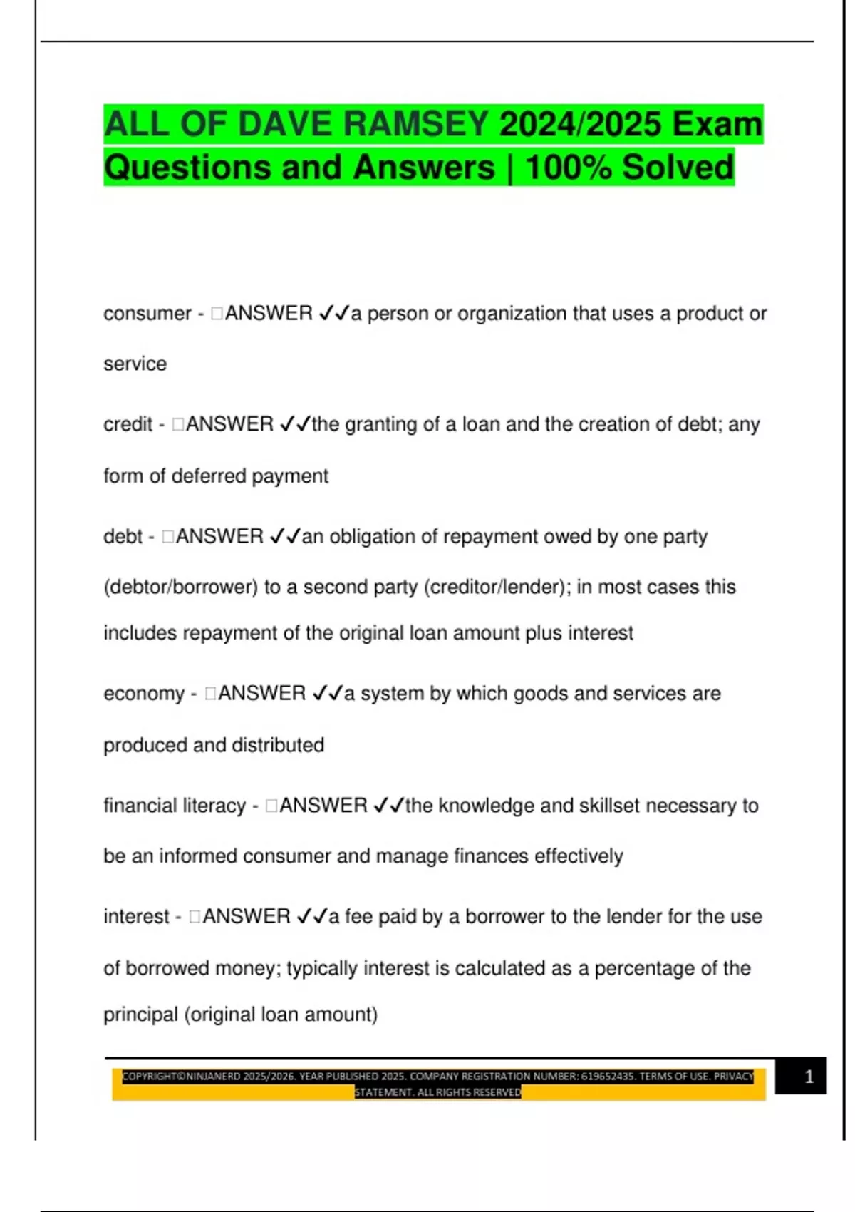 ALL OF DAVE RAMSEY 2024/2025 Exam Questions and Answers | 100% Solved