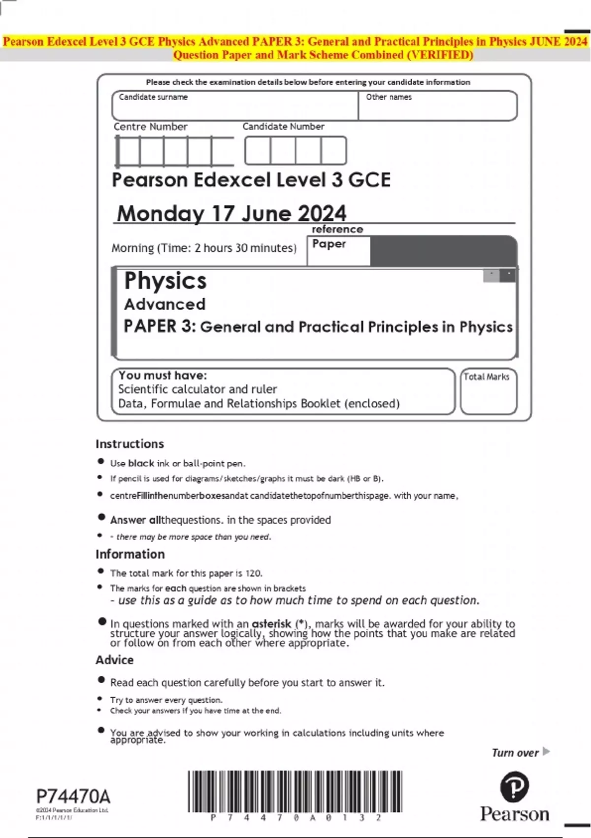 2024 Pearson Edexcel Level 3 GCE Physics Advanced PAPER 3: General and Practical Principles in Physics JUNE Question Paper and Mark Scheme COMBINED