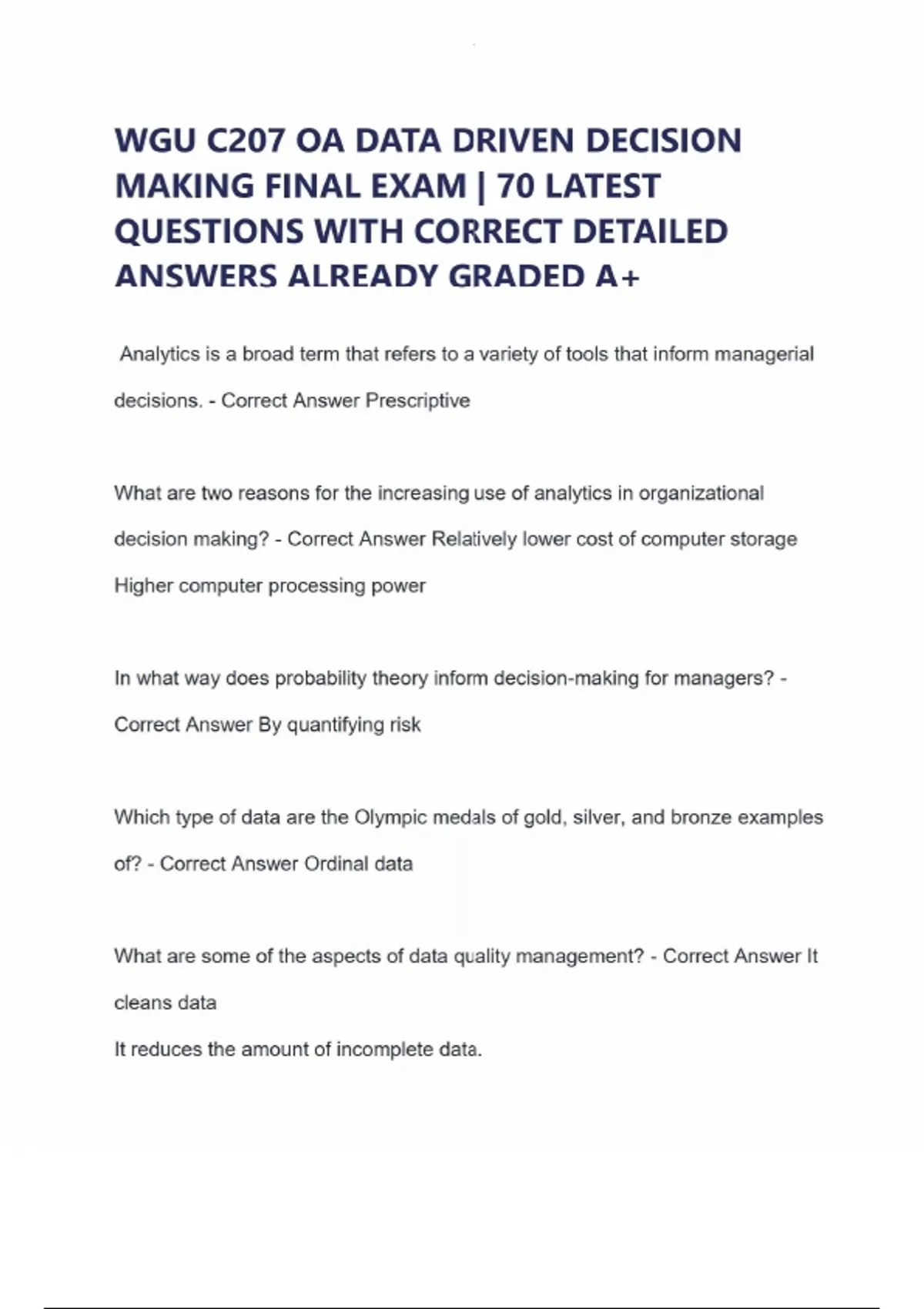 WGU C207 OA DATA DRIVEN DECISION MAKING FINAL EXAM | 70 LATEST QUESTIONS WITH CORRECT DETAILED ANSWERS ALREADY GRADED A+