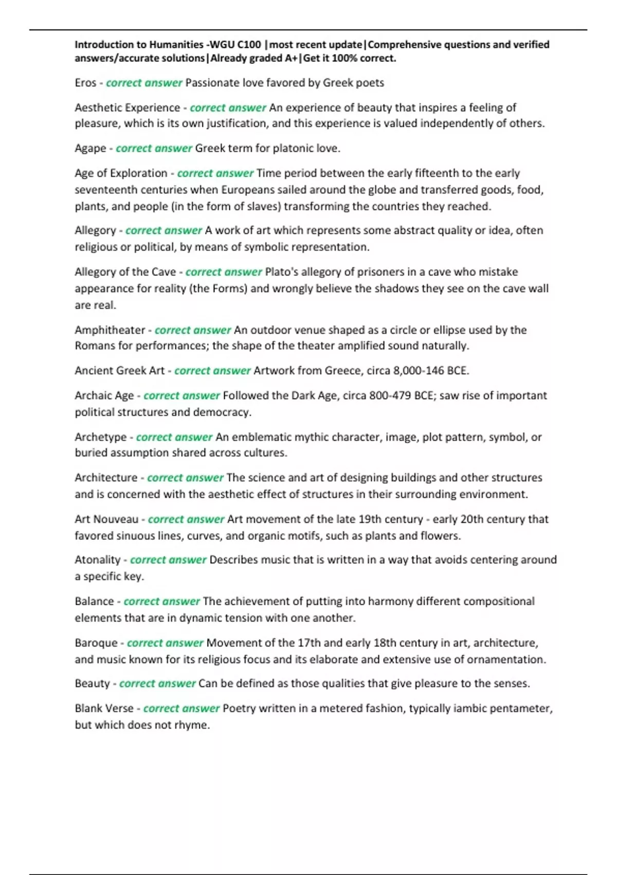 Introduction to Humanities -WGU C100 |most recent update|Comprehensive questions and verified answers/accurate solutions|Already graded A+|Get it 100% correct.-Introduction to Humanities -WGU C100 |most recent update|Comprehensive questions and verified answers/accurate solutions|Already graded A+|Get it 100% correct.