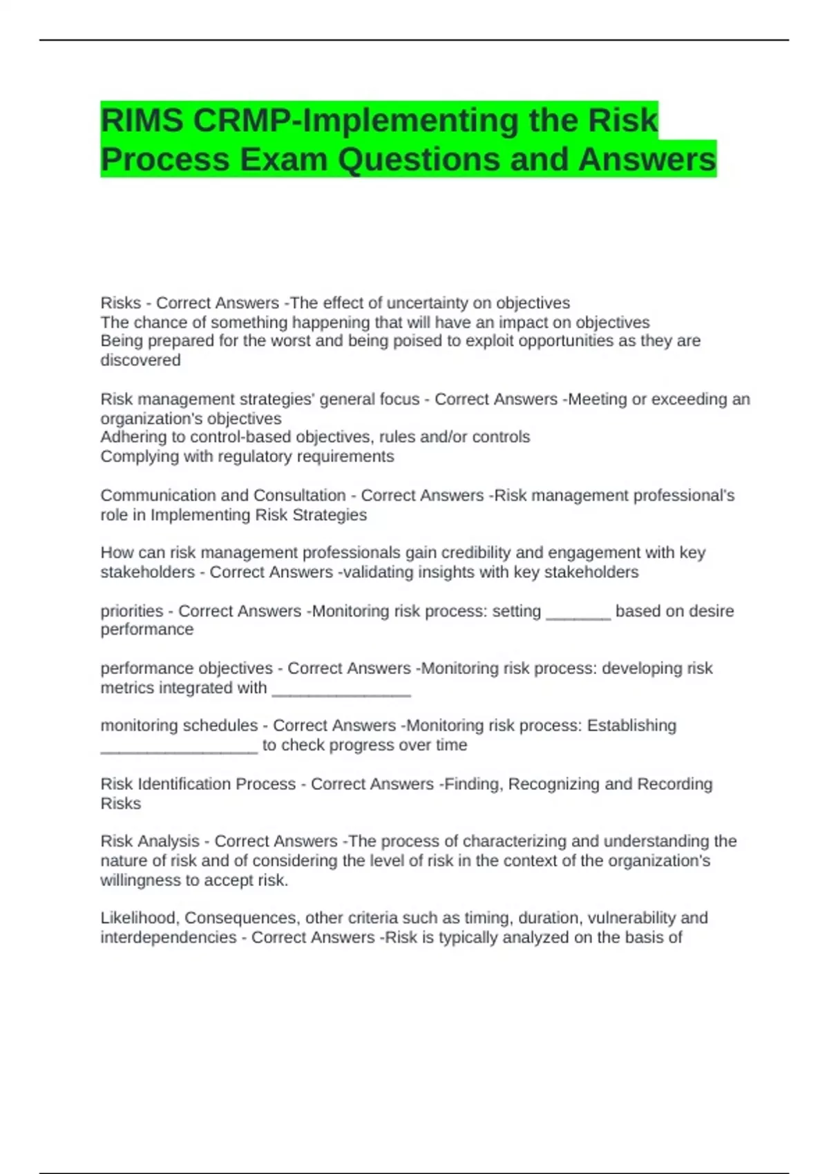 Risk management strategies' general focus - Correct Answers -Meeting or exceeding an