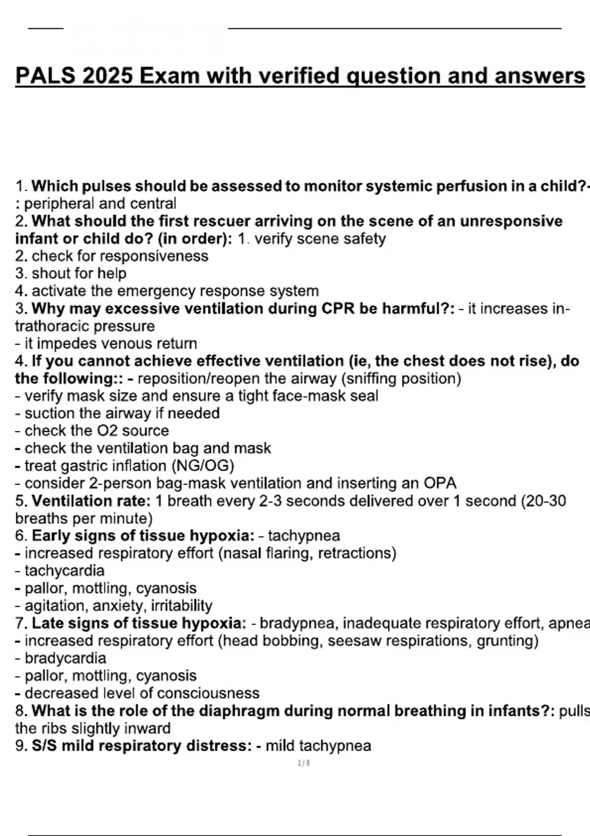 PALS 2025 Exam with verified question and answers 1. Which pulses should be assessed to monitor systemic perfusion in a child?- : peripheral and central 2. What should the first rescuer arriving on the scene of an unresponsive infant or child do? (in order): 1. verify scene safety 2. check for responsiveness 3. shout for help 4. activate the emergency response system 3. Why may excessive ventilation during CPR be harmful?: - it increases in- trathoracic pressure - it impedes venous return 4. If you cannot achieve effective ventilation (ie, the chest does not rise), do the following:: - reposition/reopen the airway (sniffing position) - verify mask size and ensure a tight face-mask seal - suction the airway if needed - check the O2 source - check the ventilation bag and mask - treat gastric inflation (NG/OG) - consider 2-person bag-mask ventilation and inserting an OPA 5. Ventilation rate: 1 breath every 2-3 seconds delivered over 1 second (20-30 breaths per minute) 6. Early signs of tissue hypoxia: - tachypnea - increased respiratory effort (nasal flaring, retractions) - tachycardia - pallor, mottling, cyanosis - agitation, anxiety, irritability