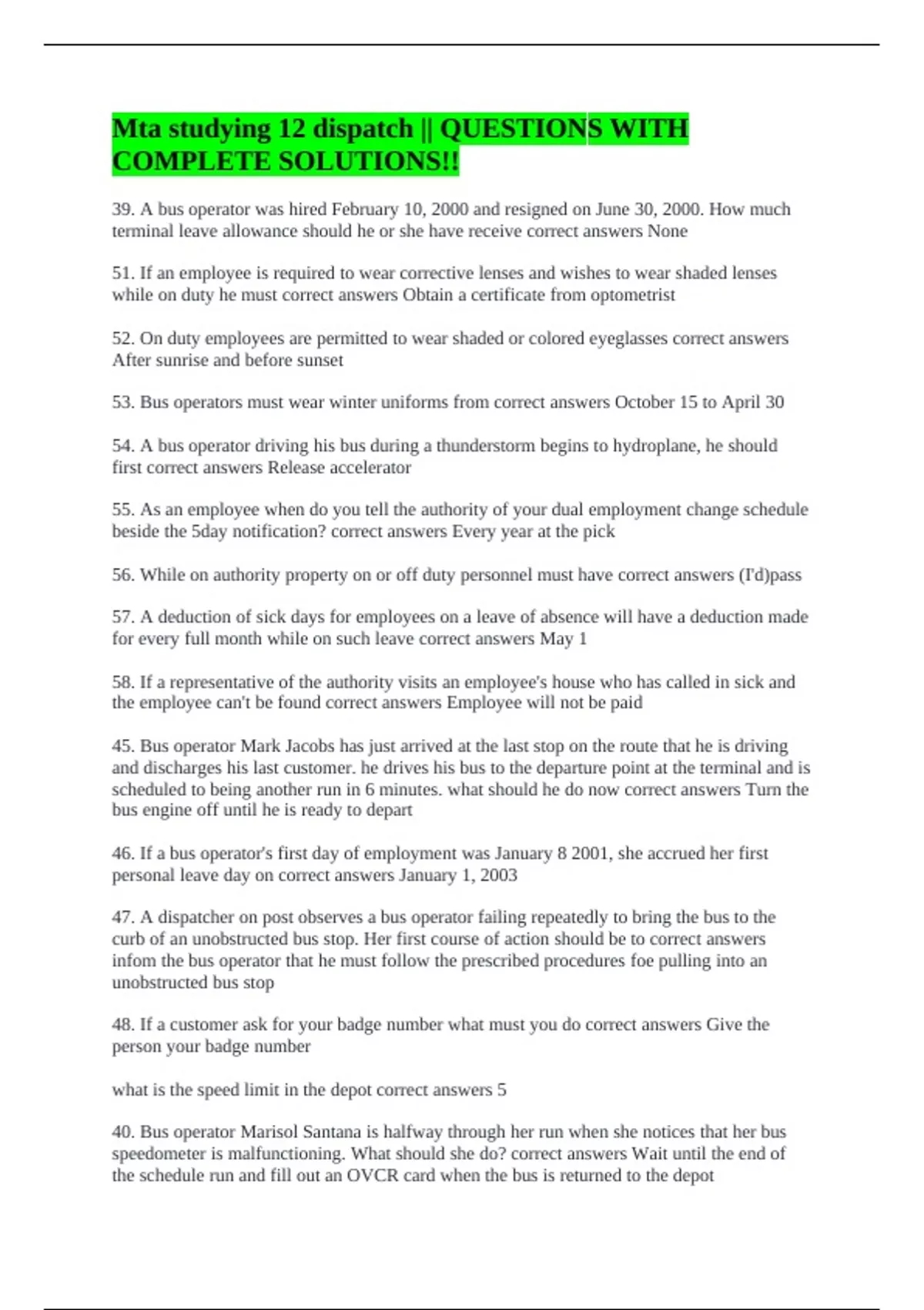 39. A bus operator was hired February 10, 2000 and resigned on June 30, 2000. How much terminal leave allowance should he or she have receive correct answers None 51. If an employee is required to wear corrective lenses and wishes to wear shaded lenses while on duty he must correct answers Obtain a certificate from optometrist 52. On duty employees are permitted to wear shaded or colored eyeglasses correct answers After sunrise and before sunset 53. Bus operators must wear winter uniforms from correct answers October 15 to April 30 54. A bus operator driving his bus during a thunderstorm begins to hydroplane, he should first correct answers Release accelerator 55. As an employee when do you tell the authority of your dual employment change schedule beside the 5day notification? correct answers Every year at the pick 56. While on authority property on or off duty personnel must have correct answers (I'd)pass 57. A deduction of sick days for employees on a leave of absence will have a deduction made for every full month while on such leave correct answers May 1 58. If a representative of the authority visits an employee's house who has called in sick and the employee can't be found correct answers Employee will not be paid 45. Bus operator Mark Jacobs has just arrived at the last stop on the route that he is driving and discharges his last customer. he drives his bus to the departure point at the terminal and is scheduled to being another run in 6 minutes. what should he do now correct answers Turn the bus engine off until he is ready to depart 46. If a bus operator's first day of employment was January 8 2001, she accrued her first personal leave day on correct answers January 1, 2003 47. A dispatcher on post observes a bus operator failing repeatedly to bring the bus to the curb of an unobstructed bus stop. Her first course of action should be to correct answers infom the bus operator that he must follow the prescribed procedures foe pulling into an unobstructed bus stop 48. If a customer ask for your badge number what must you do correct answers Give the person your badge number what is the speed limit in the depot correct answers 5 40. Bus operator Marisol Santana is halfway through her run when she notices that her bus speedometer is malfunctioning. What should she do? correct answers Wait until the end of the schedule run and fill out an OVCR card when the bus is returned to the depot