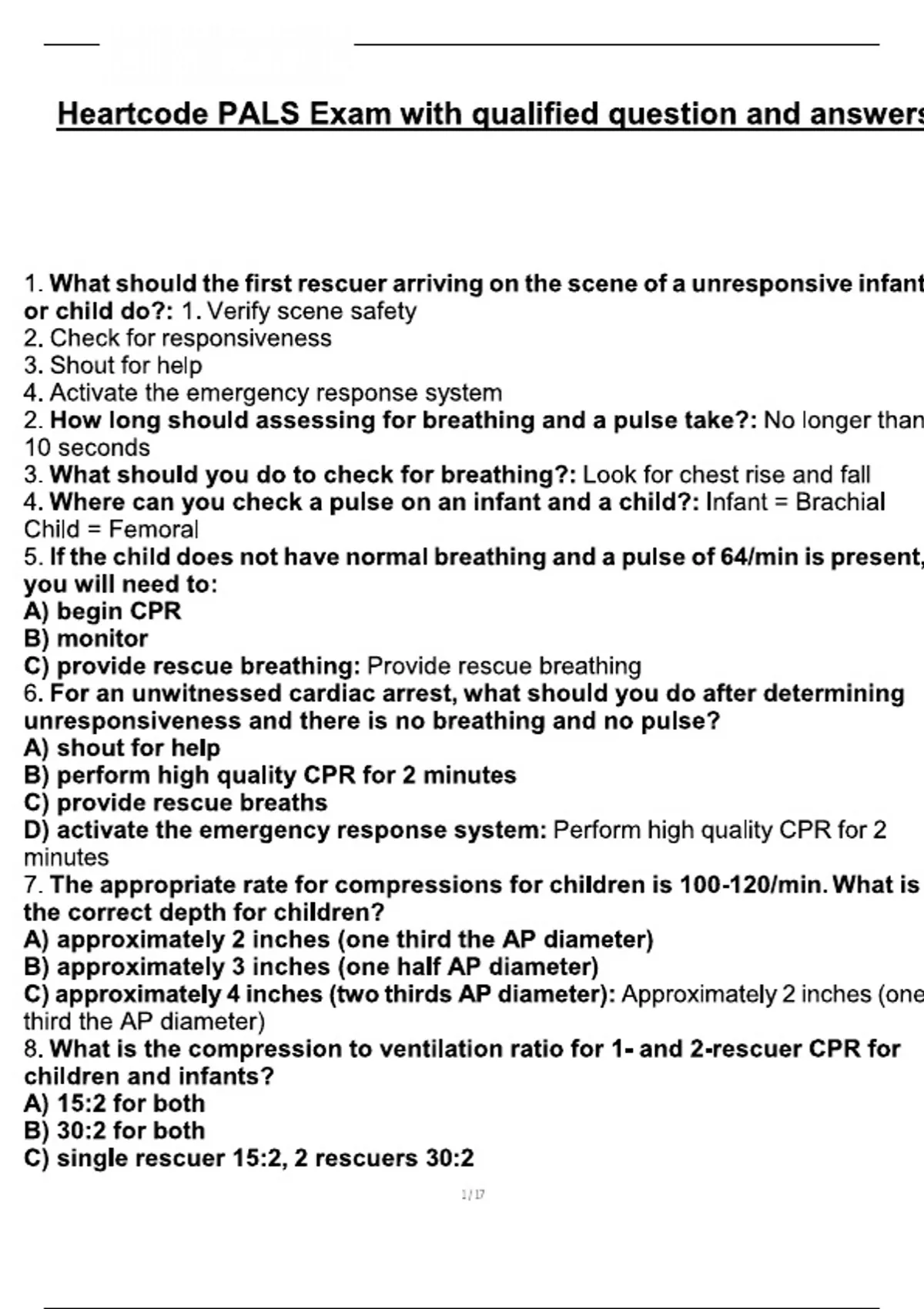 Heartcode PALS Exam with qualified question and answers 1. What should the first rescuer arriving on the scene of a unresponsive infant or child do?: 1. Verify scene safety 2. Check for responsiveness 3. Shout for help 4. Activate the emergency response system 2. How long should assessing for breathing and a pulse take?: No longer than 10 seconds 3. What should you do to check for breathing?: Look for chest rise and fall 4. Where can you check a pulse on an infant and a child?: Infant = Brachial Child = Femoral 5. If the child does not have normal breathing and a pulse of 64/min is present, you will need to: A) begin CPR B) monitor C) provide rescue breathing: Provide rescue breathing 6. For an unwitnessed cardiac arrest, what should you do after determining unresponsiveness and there is no breathing and no pulse? A) shout for help B) perform high quality CPR for 2 minutes C) provide rescue breaths D) activate the emergency response system: Perform high quality CPR for 2 minutes