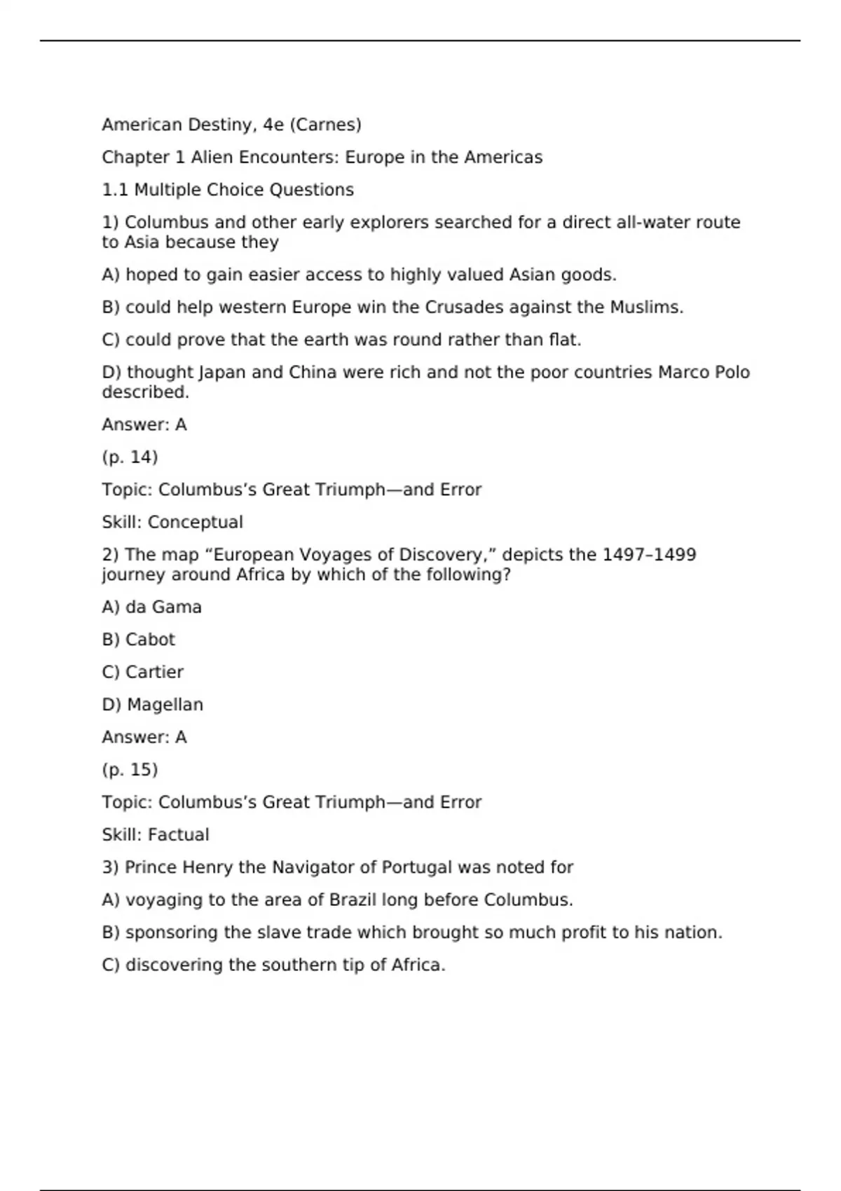=================== Test Bank for American Destiny: Narrative of a Nation, Volume 1 by Carnes - Comprehensive Exam Resources =================== Master the early American journey with our complete test bank for American Destiny, Volume 1. Perfect for students tackling the foundations of American history, these meticulously crafted questions cover every critical concept—from colonial settlements to the Civil War era. Each question aligns perfectly with Carnes' authoritative narrative, helping you reinforce key themes, identify pivotal historical moments, and understand the diverse forces that shaped our nation's beginnings. Ideal for exam preparation, self-assessment, or deepening your understanding of America's formative chapters. =================== #AmericanHistory #TestBank #CarnesTextbook #CollegeExamPrep #USHistory #HistoryEducation #AcademicResources #EarlyAmerica #HistoryStudentTools #ColonialAmerica