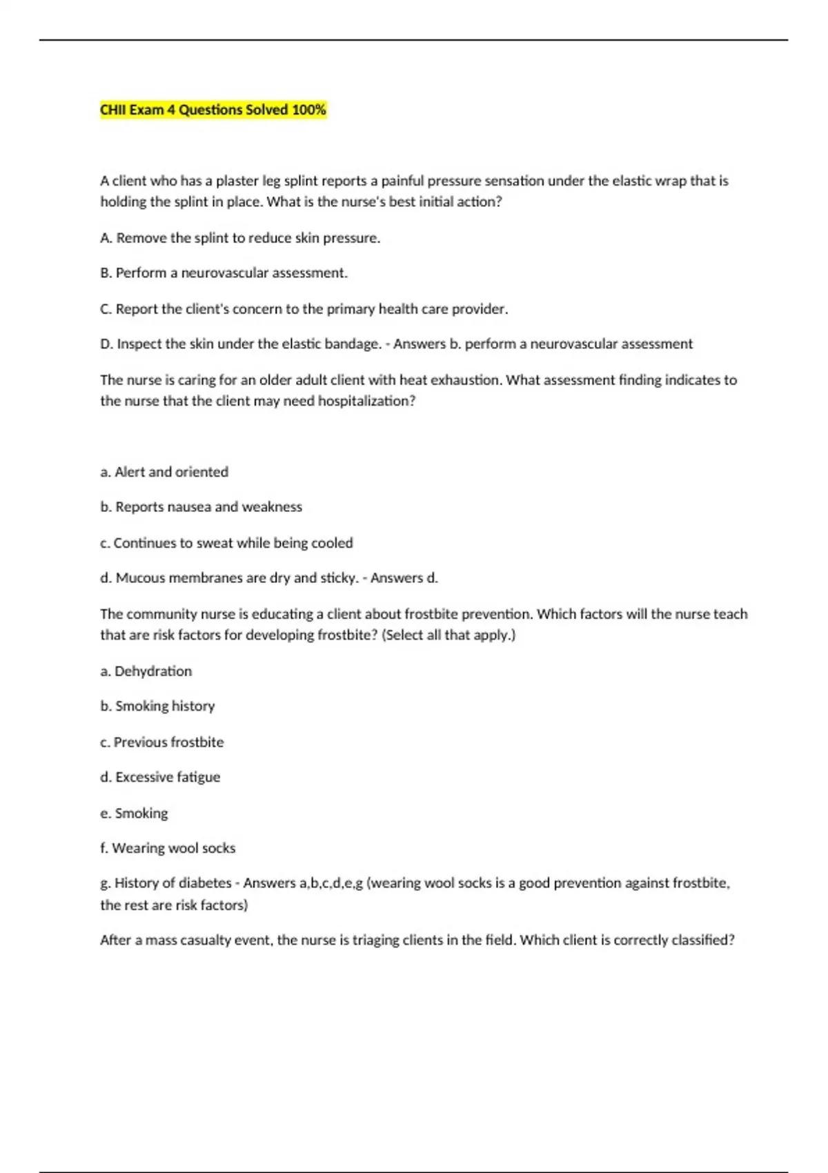CHII Exam 4 Questions Solved 100% A client who has a plaster leg splint reports a painful pressure sensation under the elastic wrap that is holding the splint in place. What is the nurse's best initial action? A. Remove the splint to reduce skin pressure. B. Perform a neurovascular assessment. C. Report the client's concern to the primary health care provider. D. Inspect the skin under the elastic bandage. - Answers b. perform a neurovascular assessment The nurse is caring for an older adult client with heat exhaustion. What assessment finding indicates to the nurse that the client may need hospitalization? a. Alert and oriented b. Reports nausea and weakness c. Continues to sweat while being cooled d. Mucous membranes are dry and sticky. - Answers d. The community nurse is educating a client about frostbite prevention. Which factors will the nurse teach that are risk factors for developing frostbite? (Select all that apply.) a. Dehydration b. Smoking history c. Previous frostbite d. Excessive fatigue e. Smoking f. Wearing wool socks g. History of diabetes - Answers a,b,c,d,e,g (wearing wool socks is a good prevention against frostbite, the rest are risk factors) After a mass casualty event, the nurse is triaging clients in the field. Which client is correctly classified? a. 38-year-old with an open femur fracture: Black tag b. 42-year-old with multiple abrasions and contusions: Yellow tag c. 54-year-old with third-degree burns over 90% of the body: Green tag d. 61-year-old who is having difficulty breathing and wheezing: Red tag - Answers d. 61 y/o w/ SOB = Red Which assessment finding does the nurse interpret as demonstrating a client's fluid resuscitation adequacy? a. Increased skin turgor b. Decreased pulse pressure c. Decreased core body temperature d. Decreased urine specific gravity - Answers d. decreased urine specific gravity (indicates more water in the urine and skin turgor is not as accurate) Which nursing intervention(s) decrease(s) the risk for cross-contamination in the client with a severe burn injury? (Select all that apply.) a. Place client in isolation. b. Encourage multiple visitors to support client. c. Ensure that no plants or flowers are in the client's room. d. Teach family members not to bring fresh fruits and vegetables to the client. e. Change gloves after cleaning and dressing of one wound area, before cleaning and dressing another. - Answers a,c,d (e decreases the risk of auto-contamination not cross-contamination) The nurse is encouraging range-of-motion exercises for the client, who states, "this hurts terribly; I don't want to do this." Identify the appropriate nursing response(s). (Select all that apply.) a. "You have to do the exercises to get well." b. "Range-of-motion helps promote mobility." c. "Just visualize a beach to get your mind off of the pain." d. "Let me check when you were last given pain medication." e. "What techniques for pain management have you used in the past that were helpful?" f. "The health care provider has ordered these exercises, and it is important that you do them as instructed." - Answers b,d,e Which signs and symptoms does the nurse expect to find in clients with any type of anemia? (Select all that apply.) a. Exercise intolerance b. Fatigue c. Glossitis d. Jaundice