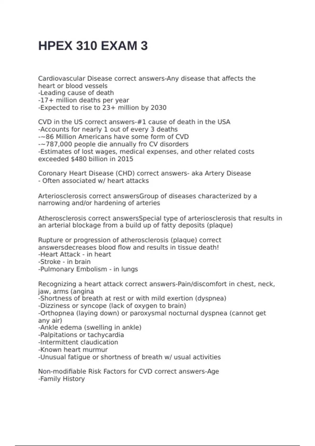 Cardiovascular Disease correct answers-Any disease that affects the heart or blood vessels -Leading cause of death -17+ million deaths per year -Expected to rise to 23+ million by 2030 CVD in the US correct answers-#1 cause of death in the USA -Accounts for nearly 1 out of every 3 deaths -~86 Million Americans have some form of CVD -~787,000 people die annually fro CV disorders -Estimates of lost wages, medical expenses, and other related costs exceeded $480 billion in 2015 Coronary Heart Disease (CHD) correct answers- aka Artery Disease - Often associated w/ heart attacks Arteriosclerosis correct answersGroup of diseases characterized by a narrowing and/or hardening of arteries Atherosclerosis correct answersSpecial type of arteriosclerosis that results in an arterial blockage from a build up of fatty deposits (plaque) Rupture or progression of atherosclerosis (plaque) correct answersdecreases blood flow and results in tissue death! -Heart Attack - in heart -Stroke - in brain -Pulmonary Embolism - in lungs Recognizing a heart attack correct answers-Pain/discomfort in chest, neck, jaw, arms (angina -Shortness of breath at rest or with mild exertion (dyspnea) -Dizziness or syncope (lack of oxygen to brain) -Orthopnea (laying down) or paroxysmal nocturnal dyspnea (cannot get any air) -Ankle edema (swelling in ankle) -Palpitations or tachycardia -Intermittent claudication -Known heart murmur -Unusual fatigue or shortness of breath w/ usual activities Non-modifiable Risk Factors for CVD correct answers-Age -Family History