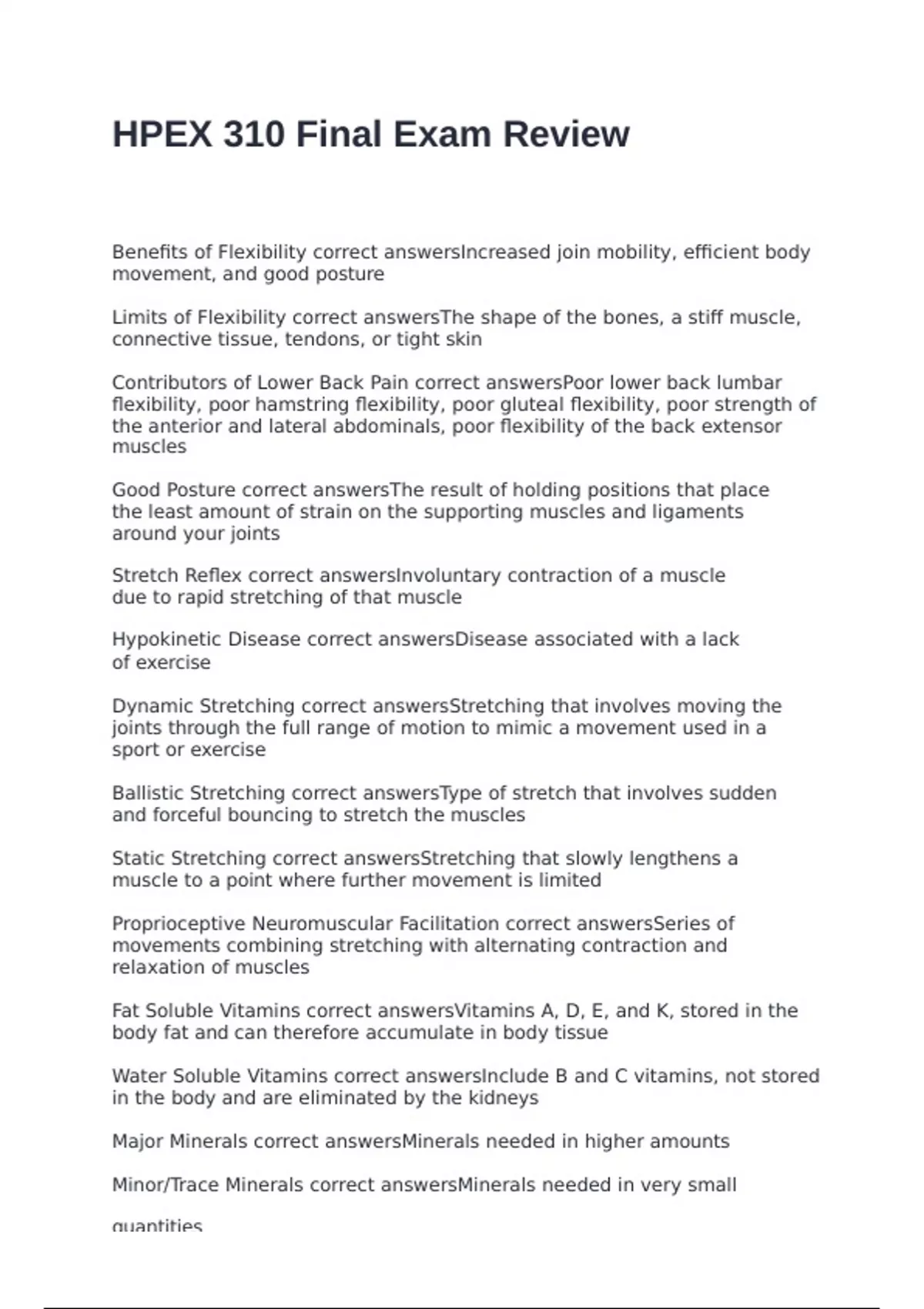 Benefits of Flexibility correct answersIncreased join mobility, efficient body movement, and good posture Limits of Flexibility correct answersThe shape of the bones, a stiff muscle, connective tissue, tendons, or tight skin Contributors of Lower Back Pain correct answersPoor lower back lumbar flexibility, poor hamstring flexibility, poor gluteal flexibility, poor strength of the anterior and lateral abdominals, poor flexibility of the back extensor muscles Good Posture correct answersThe result of holding positions that place the least amount of strain on the supporting muscles and ligaments around your joints Stretch Reflex correct answersInvoluntary contraction of a muscle due to rapid stretching of that muscle Hypokinetic Disease correct answersDisease associated with a lack of exercise Dynamic Stretching correct answersStretching that involves moving the joints through the full range of motion to mimic a movement used in a sport or exercise Ballistic Stretching correct answersType of stretch that involves sudden and forceful bouncing to stretch the muscles Static Stretching correct answersStretching that slowly lengthens a muscle to a point where further movement is limited Proprioceptive Neuromuscular Facilitation correct answersSeries of movements combining stretching with alternating contraction and relaxation of muscles Fat Soluble Vitamins correct answersVitamins A, D, E, and K, stored in the body fat and can therefore accumulate in body tissue Water Soluble Vitamins correct answersInclude B and C vitamins, not stored in the body and are eliminated by the kidneys Major Minerals correct answersMinerals needed in higher amounts Minor/Trace Minerals correct answersMinerals needed in very small quantities