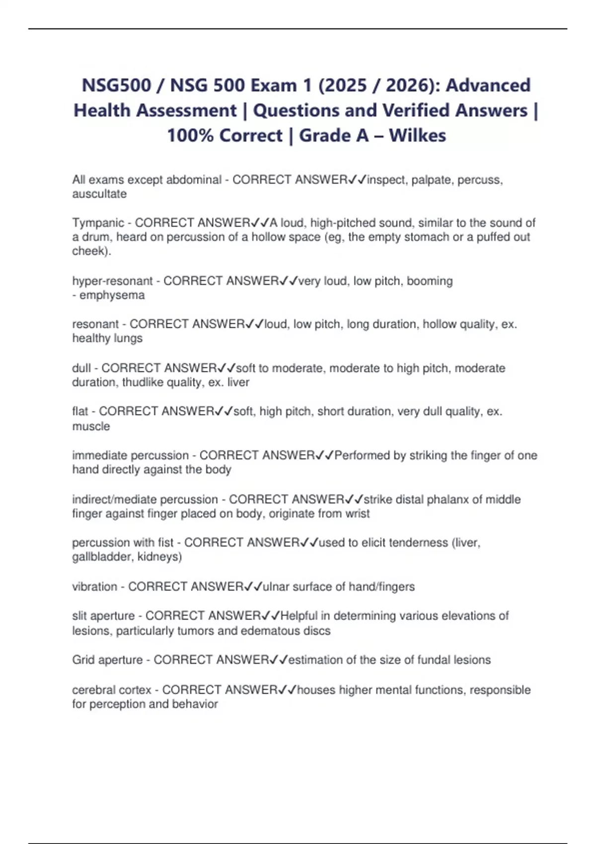 NSG500 / NSG 500 Exam 1 (2025 / 2026): Advanced Health Assessment | Questions and Verified Answers | 100% Correct | Grade A – Wilkes