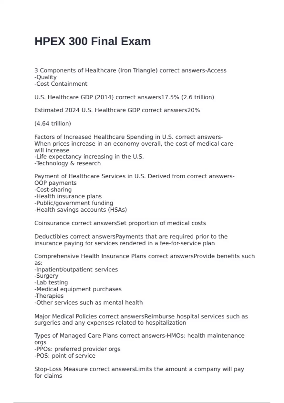 Stop-Loss Measure correct answersLimits the amount a company will pay