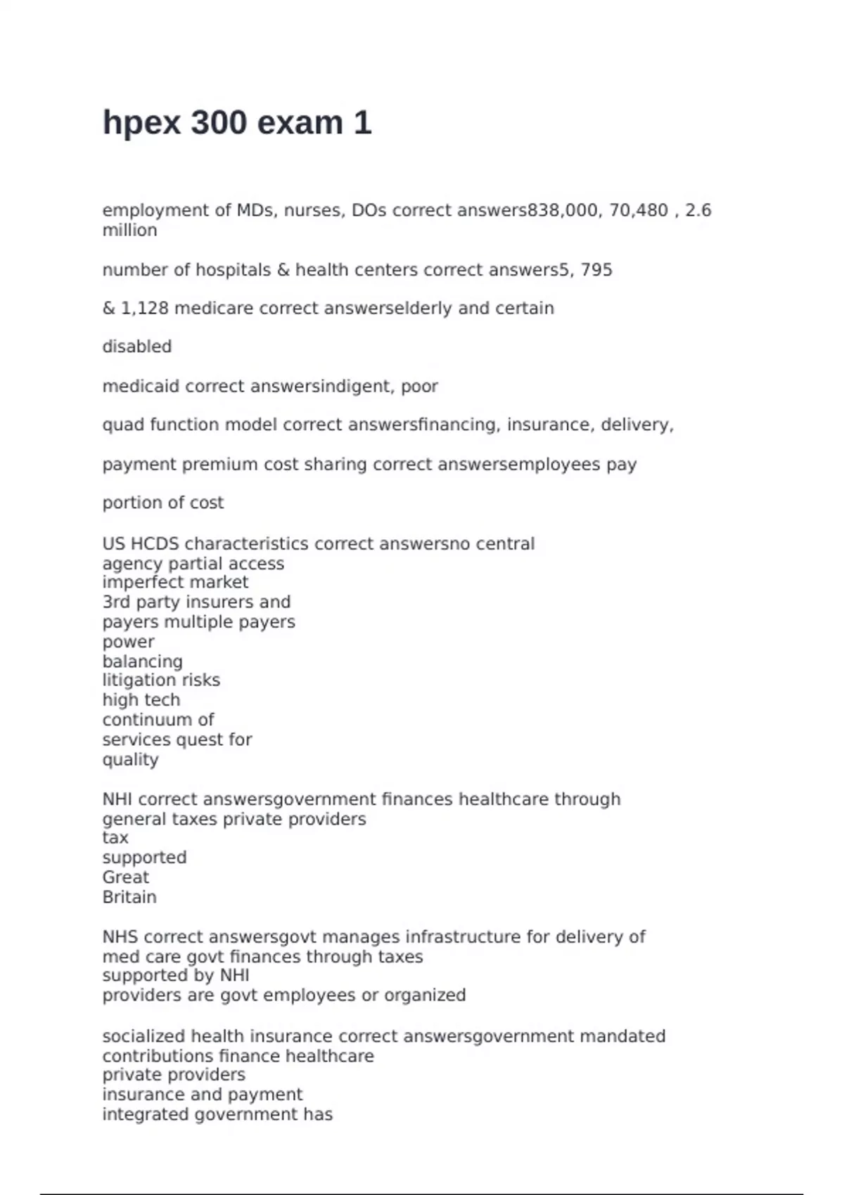 employment of MDs, nurses, DOs correct answers838,000, 70,480 , 2.6 million number of hospitals & health centers correct answers5, 795 & 1,128 medicare correct answerselderly and certain disabled medicaid correct answersindigent, poor quad function model correct answersfinancing, insurance, delivery, payment premium cost sharing correct answersemployees pay portion of cost US HCDS characteristics correct answersno central agency partial access imperfect market 3rd party insurers and payers multiple payers power balancing litigation risks high tech continuum of services quest for quality NHI correct answersgovernment finances healthcare through general taxes private providers tax supported Great Britain NHS correct answersgovt manages infrastructure for delivery of med care govt finances through taxes supported by NHI providers are govt employees or organized socialized health insurance correct answersgovernment mandated contributions finance healthcare private providers insurance and payment integrated government has overall control Germany, Israel, Japan