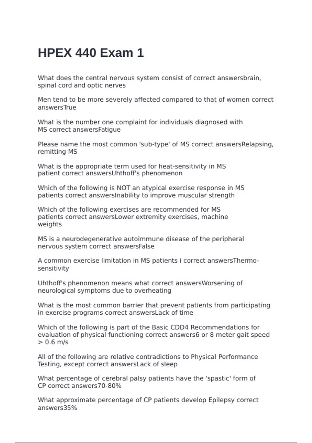 What does the central nervous system consist of correct answersbrain, spinal cord and optic nerves Men tend to be more severely affected compared to that of women correct answersTrue What is the number one complaint for individuals diagnosed with MS correct answersFatigue Please name the most common 'sub-type' of MS correct answersRelapsing, remitting MS What is the appropriate term used for heat-sensitivity in MS patient correct answersUhthoff's phenomenon Which of the following is NOT an atypical exercise response in MS patients correct answersInability to improve muscular strength Which of the following exercises are recommended for MS patients correct answersLower extremity exercises, machine weights MS is a neurodegenerative autoimmune disease of the peripheral nervous system correct answersFalse A common exercise limitation in MS patients i correct answersThermo-sensitivity Uhthoff's phenomenon means what correct answersWorsening of neurological symptoms due to overheating What is the most common barrier that prevent patients from participating in exercise programs correct answersLack of time Which of the following is part of the Basic CDD4 Recommendations for evaluation of physical functioning correct answers6 or 8 meter gait speed > 0.6 m/s All of the following are relative contradictions to Physical Performance Testing, except correct answersLack of sleep What percentage of cerebral palsy patients have the 'spastic' form of CP correct answers70-80% What approximate percentage of CP patients