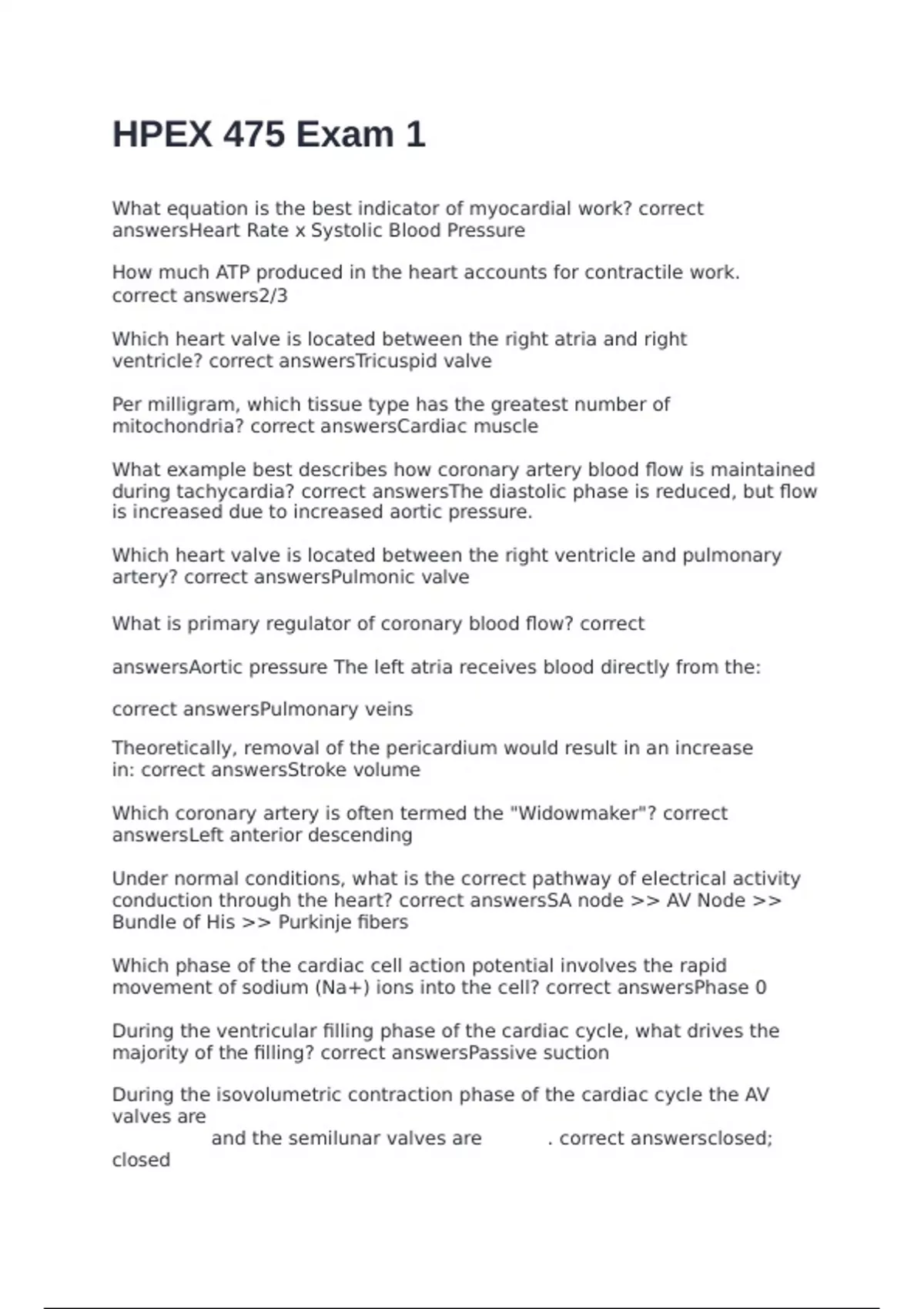 What equation is the best indicator of myocardial work? correct answersHeart Rate x Systolic Blood Pressure How much ATP produced in the heart accounts for contractile work. correct answers2/3 Which heart valve is located between the right atria and right ventricle? correct answersTricuspid valve Per milligram, which tissue type has the greatest number of mitochondria? correct answersCardiac muscle What example best describes how coronary artery blood flow is maintained during tachycardia? correct answersThe diastolic phase is reduced, but flow is increased due to increased aortic pressure. Which heart valve is located between the right ventricle and pulmonary artery? correct answersPulmonic valve What is primary regulator of coronary blood flow? correct answersAortic pressure The left atria receives blood directly from the: correct answersPulmonary veins Theoretically, removal of the pericardium would result in an increase in: correct answersStroke volume Which coronary artery is often termed the "Widowmaker"? correct answersLeft anterior descending Under normal conditions, what is the correct pathway of electrical activity conduction through the heart? correct answersSA node >> AV Node >> Bundle of His >> Purkinje fibers Which phase of the cardiac cell action potential involves the rapid movement of sodium (Na+) ions into the cell? correct answersPhase 0 During the ventricular filling phase of the cardiac cycle, what drives the majority of the filling? correct answersPassive suction During the isovolumetric contraction phase of the cardiac cycle the AV valves are _________ and the semilunar valves are _________. correct answersclosed; closed