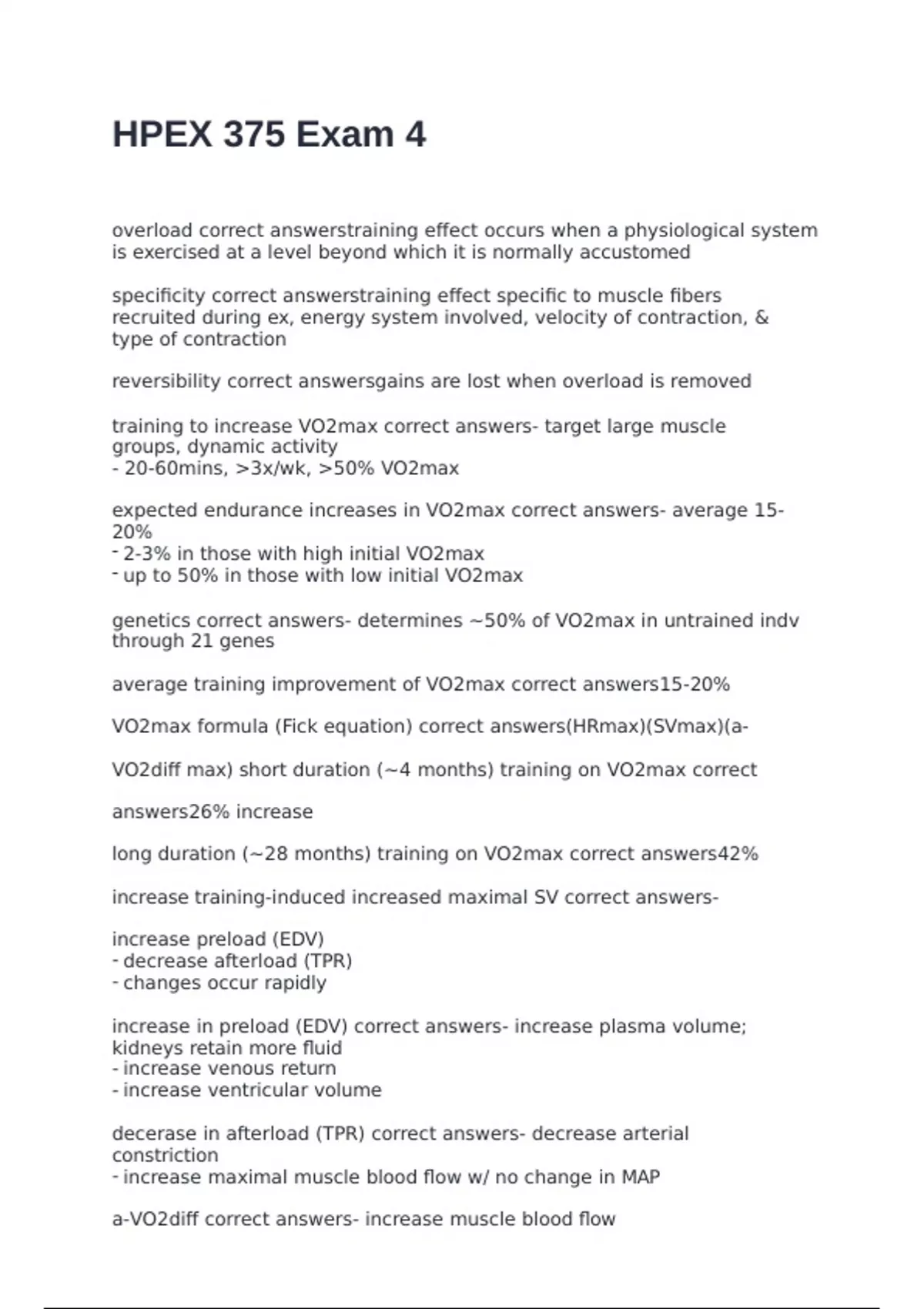 overload correct answerstraining effect occurs when a physiological system is exercised at a level beyond which it is normally accustomed specificity correct answerstraining effect specific to muscle fibers recruited during ex, energy system involved, velocity of contraction, & type of contraction reversibility correct answersgains are lost when overload is removed training to increase VO2max correct answers- target large muscle groups, dynamic activity - 20-60mins, >3x/wk, >50% VO2max expected endurance increases in VO2max correct answers- average 15-20% - 2-3% in those with high initial VO2max - up to 50% in those with low initial VO2max genetics correct answers- determines ~50% of VO2max in untrained indv through 21 genes average training improvement of VO2max correct answers15-20% VO2max formula (Fick equation) correct answers(HRmax)(SVmax)(a-VO2diff max) short duration (~4 months) training on VO2max correct answers26% increase long duration (~28 months) training on VO2max correct answers42% increase training-induced increased maximal SV correct answers- increase preload (EDV) - decrease afterload (TPR) - changes occur rapidly increase in preload (EDV) correct answers- increase plasma volume; kidneys retain more fluid - increase venous return - increase ventricular volume decerase in afterload (TPR) correct answers- decrease arterial constriction - increase maximal muscle blood flow w/ no change in MAP a-VO2diff correct answers- increase muscle blood flow - improved ability of muscle to extract O2 from blood