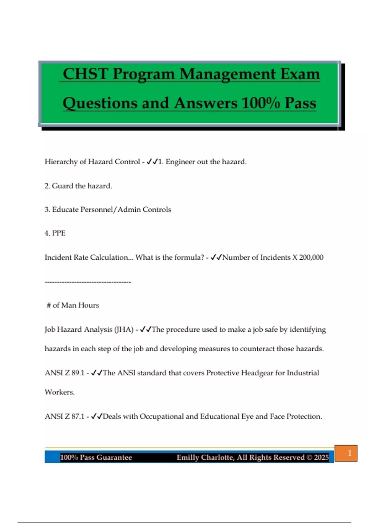 CHST Program Management Exam Questions and Answers 100% Pass Hierarchy of Hazard Control - 1. Engineer out the hazard. 2. Guard the hazard. 3. Educate Personnel/Admin Controls 4. PPE Incident Rate Calculation... What is the formula? - Number of Incidents X 200,000 ----------------------------------- # of Man Hours Job Hazard Analysis (JHA) - The procedure used to make a job safe by identifying hazards in each step of the job and developing measures to counteract those hazards. ANSI Z 89.1 - The ANSI standard that covers Protective Headgear for Industrial Workers. ANSI Z 87.1 - Deals with Occupational and Educational Eye and Face Protection. 2100% Pass Guarantee Emilly Charlotte, All Rights Reserved © 2025 ANSI Z 16.4 - Covers Uniform Recordkeeping for Occupational Injuries and Illnesses. ANSI A 12.1 - Standard for Floor and Wall Openings, Railings, and ToeBoards. Job Safety Analysis - A systematic analysis of job elements. System Safety Analysis - Broad term covering all of the various system safety tools used in the analysis of stem risk. Fault Tree Analysis - Process of using deductive logic to determine the combination of events that caused a hazardous event to occur. MORT- Management Oversight and Risk Tree - A formal decis
