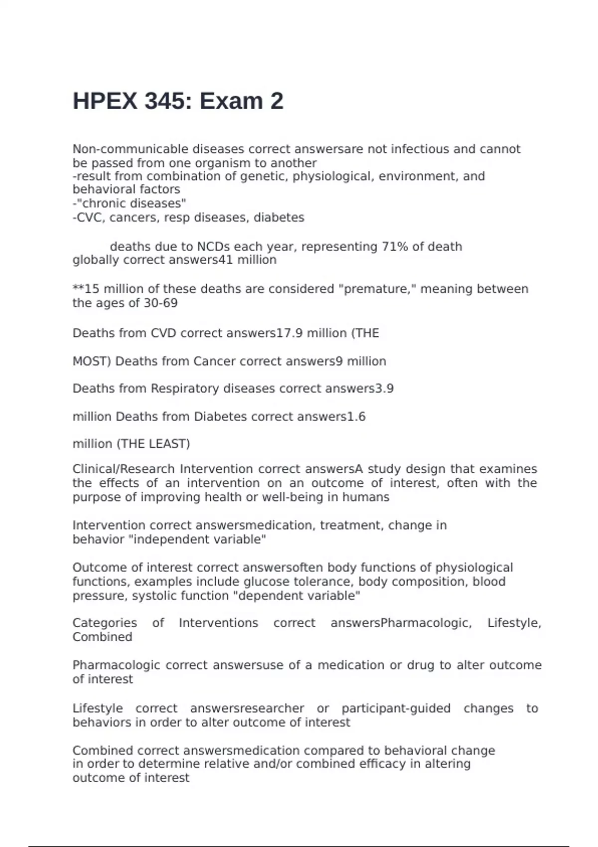 Non-communicable diseases correct answersare not infectious and cannot be passed from one organism to another -result from combination of genetic, physiological, environment, and behavioral factors -"chronic diseases" -CVC, cancers, resp diseases, diabetes _____ deaths due to NCDs each year, representing 71% of death globally correct answers41 million **15 million of these deaths are considered "premature," meaning between the ages of 30-69 Deaths from CVD correct answers17.9 million (THE MOST) Deaths from Cancer correct answers9 million Deaths from Respiratory diseases correct answers3.9 million Deaths from Diabetes correct answers1.6 million (THE LEAST) Clinical/Research Intervention correct answersA study design that examines the effects of an intervention on an outcome of interest, often with the purpose of improving health or well-being in humans Intervention correct answersmedication, treatment, change in behavior "independent variable" Outcome of interest correct answersoften body functions of physiological functions, examples include glucose tolerance, body composition, blood pressure, systolic function "dependent variable" Categories of Interventions correct answersPharmacologic, Lifestyle, Combined Pharmacologic correct answersuse of a medication or drug to alter outcome of interest Lifestyle correct answersresearcher or participant-guided changes to behaviors in order to alter outcome of interest Combined correct answersmedication compared to behavioral change in order to determine relative and/or combined efficacy in altering outcome of interest