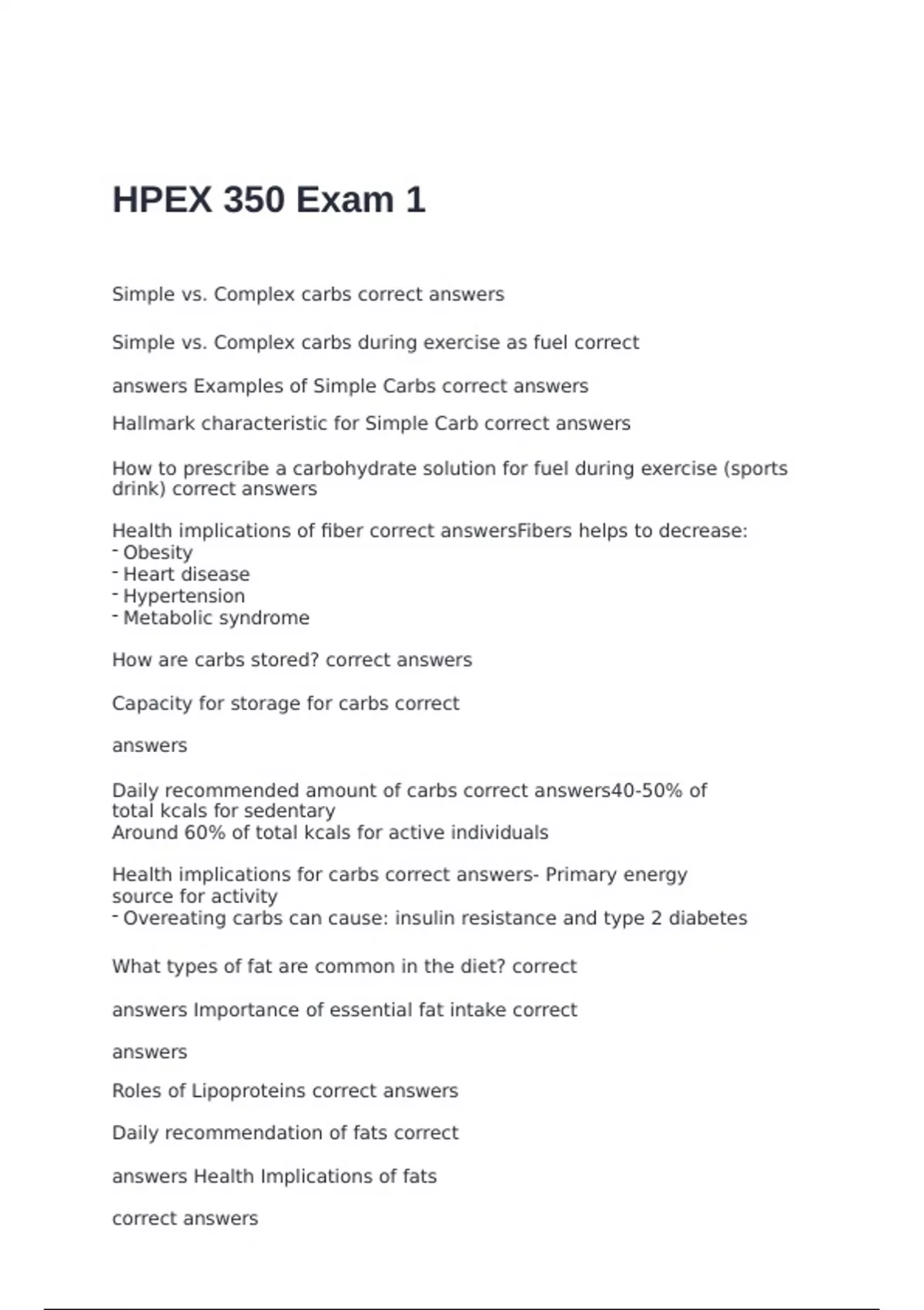 Simple vs. Complex carbs correct answers Simple vs. Complex carbs during exercise as fuel correct answers Examples of Simple Carbs correct answers Hallmark characteristic for Simple Carb correct answers How to prescribe a carbohydrate solution for fuel during exercise (sports drink) correct answers Health implications of fiber correct answersFibers helps to decrease: - Obesity - Heart disease - Hypertension - Metabolic syndrome How are carbs stored? correct answers Capacity for storage for carbs correct answers Daily recommended amount of carbs correct answers40-50% of total kcals for sedentary Around 60% of total kcals for active individuals Health implications for carbs correct answers- Primary energy source for activity - Overeating carbs can cause: insulin resistance and type 2 diabetes What types of fat are common in the diet? correct answers Importance of essential fat intake correct answers Roles of Lipoproteins correct answers Daily recommendation of fats correct answers Health Implications of fats correct answers