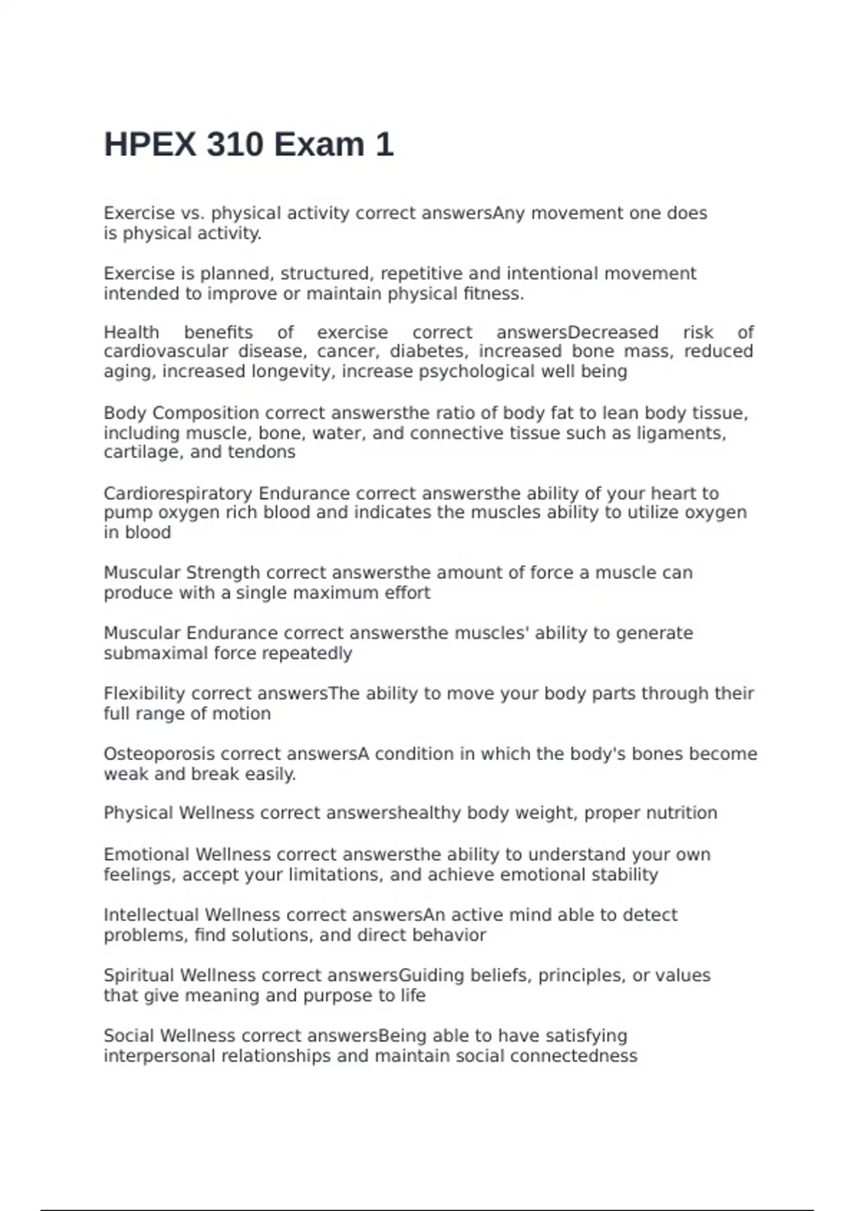 Exercise vs. physical activity correct answersAny movement one does is physical activity. Exercise is planned, structured, repetitive and intentional movement intended to improve or maintain physical fitness. Health benefits of exercise correct answersDecreased risk of cardiovascular disease, cancer, diabetes, increased bone mass, reduced aging, increased longevity, increase psychological well being Body Composition correct answersthe ratio of body fat to lean body tissue, including muscle, bone, water, and connective tissue such as ligaments, cartilage, and tendons Cardiorespiratory Endurance correct answersthe ability of your heart to pump oxygen rich blood and indicates the muscles ability to utilize oxygen in blood Muscular Strength correct answersthe amount of force a muscle can produce with a single maximum effort Muscular Endurance correct answersthe muscles' ability to generate submaximal force repeatedly Flexibility correct answersThe ability to move your body parts through their full range of motion Osteoporosis correct answersA condition in which the body's bones become weak and break easily. Physical Wellness correct answershealthy body weight, proper nutrition Emotional Wellness correct answersthe ability to understand your own feelings, accept your limitations, and achieve emotional stability Intellectual Wellness correct answersAn active mind able to detect problems, find solutions, and direct behavior Spiritual Wellness correct answersGuiding beliefs, principles, or values that give meaning and purpose to life Social Wellness correct answersBeing able to have satisfying interpersonal relationships and maintain social connectedness