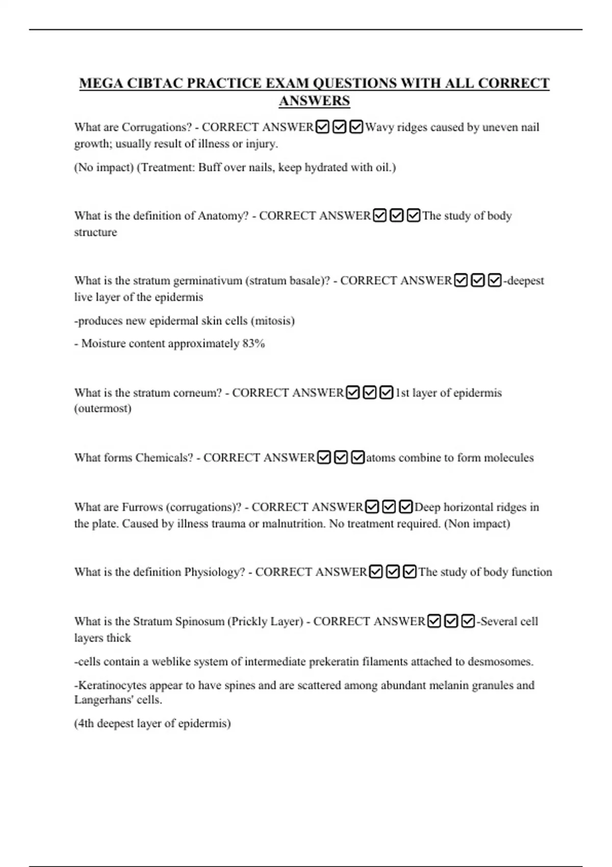 MEGA CIBTAC PRACTICE EXAM QUESTIONS WITH ALL CORRECT ANSWERS What are Corrugations? - CORRECT ANSWERWavy ridges caused by uneven nail growth; usually result of illness or injury. (No impact) (Treatment: Buff over nails, keep hydrated with oil.)