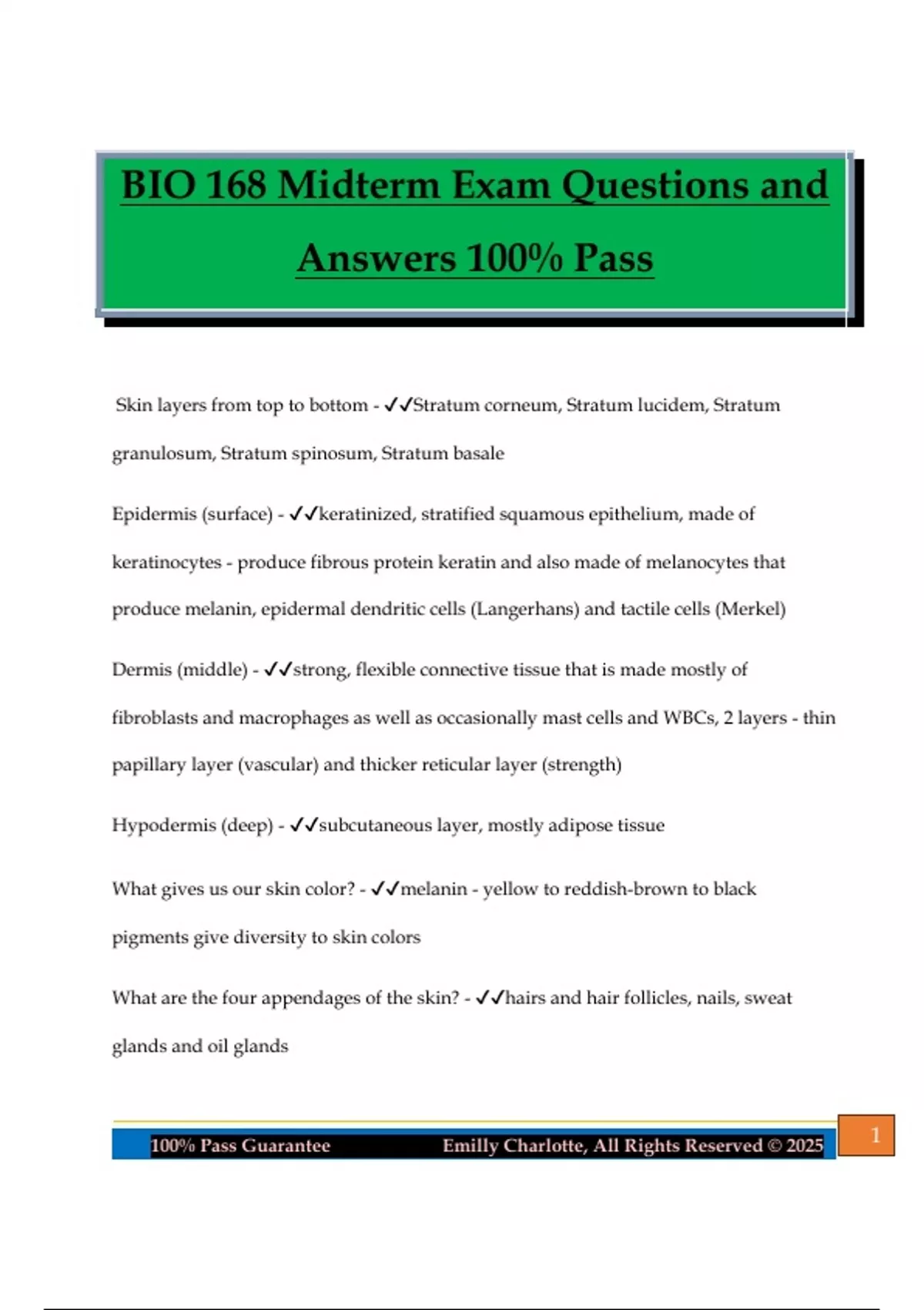 BIO 168 Midterm Exam Questions and Answers 100% Pass Skin layers from top to bottom - Stratum corneum, Stratum lucidem, Stratum granulosum, Stratum spinosum, Stratum basale Epidermis (surface) - keratinized, stratified squamous epithelium, made of keratinocytes - produce fibrous protein keratin and also made of melanocytes that produce melanin, epidermal dendritic cells (Langerhans) and tactile cells (Merkel) Dermis (middle) - strong, flexible connective tissue that is made mostly of fibroblasts and macrophages as well as occasionally mast cells and WBCs, 2 layers - thin papillary layer (vascular) and thicker reticular layer (strength) Hypodermis (deep) - subcutaneous layer, mostly adipose tissue What gives us our skin color? - melanin - yellow to reddish-brown to black pigments give diversity to skin colors What are the four appendages of the skin? - hairs and hair follicles, nails, sweat glands and oil glands 2100% Pass Guarantee Emilly Charlotte, All Rights Reserved © 2025 What is the function of the hair appendage? - alerting the body to the presence of insects on skin, guarding scalp against trauma, heat loss and sunlight What is the function of the nails appendage? - protect the end of fingers/toes from injury, allow ability to pick up objects, support tips What is the function of the sweat glands appendage? - apocrine - sexually stimulated scent glands, eccrine - most common sweat gland, thermoregulation, mammary glands in females secrete milk (modified apocrine) What are the functions of skin? - Protection, body temperature regulation, cutaneous sensation, metabolic functions, blood reservoir, excretion Basal cell carcinoma - stratum basale cells proliferate and slowly invade dermis and hypodermis, least malignant, most common Squamus cell carcinoma - keratinocytes of stratum spinosum proliferate forming lesions most often on head Melanoma - melanocytes proliferate and rapidly metastasi