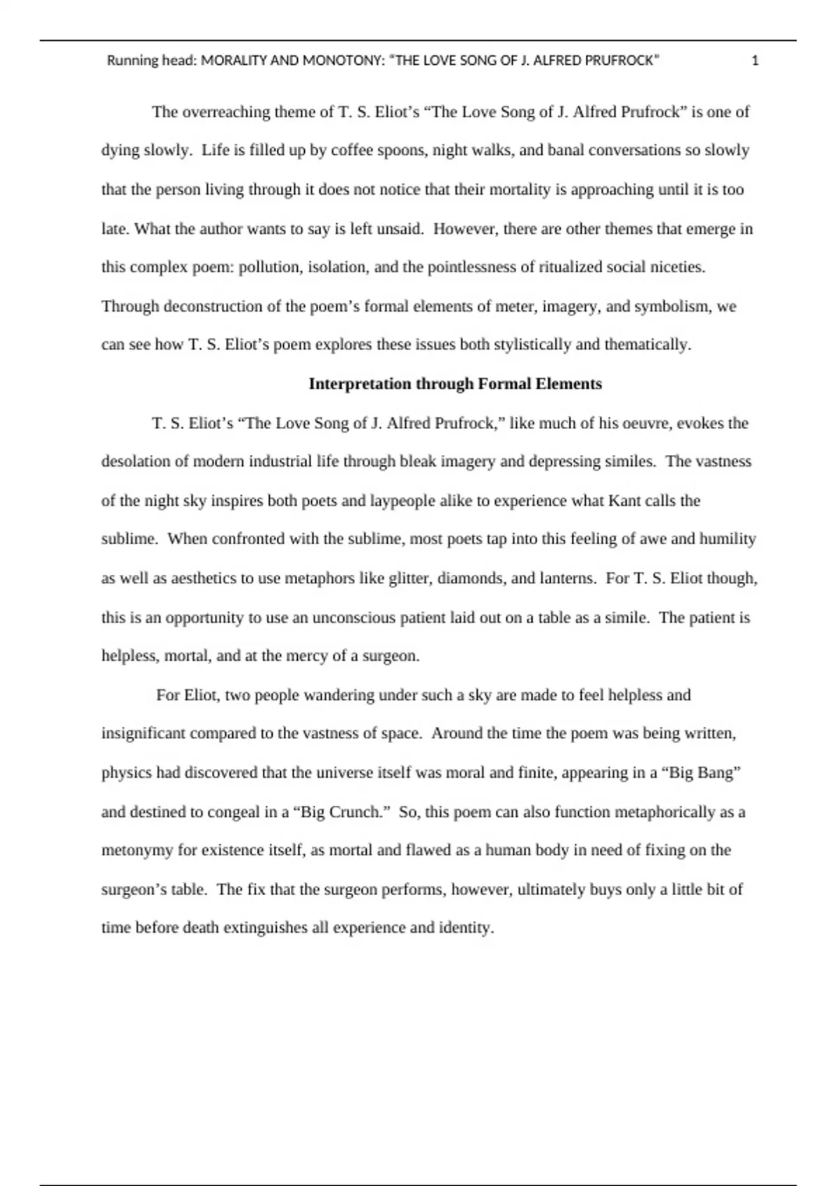 , Running head: MORALITY AND MONOTONY: “THE LOVE SONG OF J. ALFRED PRUFROCK” 2