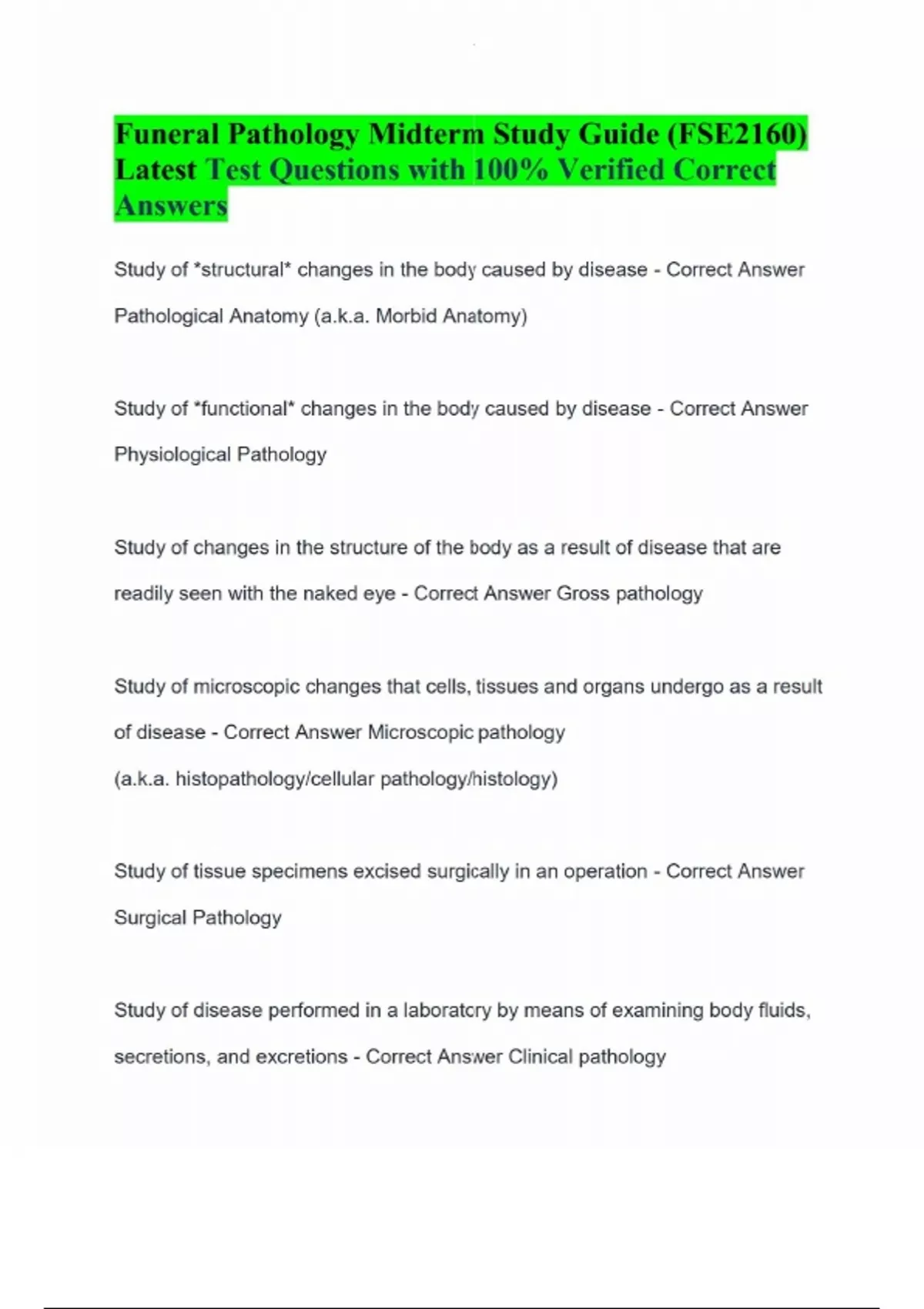 Funeral Pathology Midterm Study Guide (FSE2160) Latest Test Questions with 100% Verified Correct Answers Study of *structural* changes in the body caused by disease - Correct Answer Pathological Anatomy (a.k.a. Morbid Anatomy) Study of *functional* changes in the body caused by disease - Correct Answer Physiological Pathology Study of changes in the structure of the body as a result of disease that are readily seen with the naked eye - Correct Answer Gross pathology Study of microscopic changes that cells, tissues and organs undergo as a result of disease - Correct Answer Microscopic pathology (a.k.a. histopathology/cellular pathology/histology) Study of tissue specimens excised surgically in an operation - Correct Answer Surgical Pathology Study of disease performed in a laboratory by means of examining body fluids, secretions, and excretions - Correct Answer Clinical pathology Study of disease to ascertain cause and manner of death, as related to a criminal investigation - Correct Answer Medico-legal Pathology (Forensic Pathology)