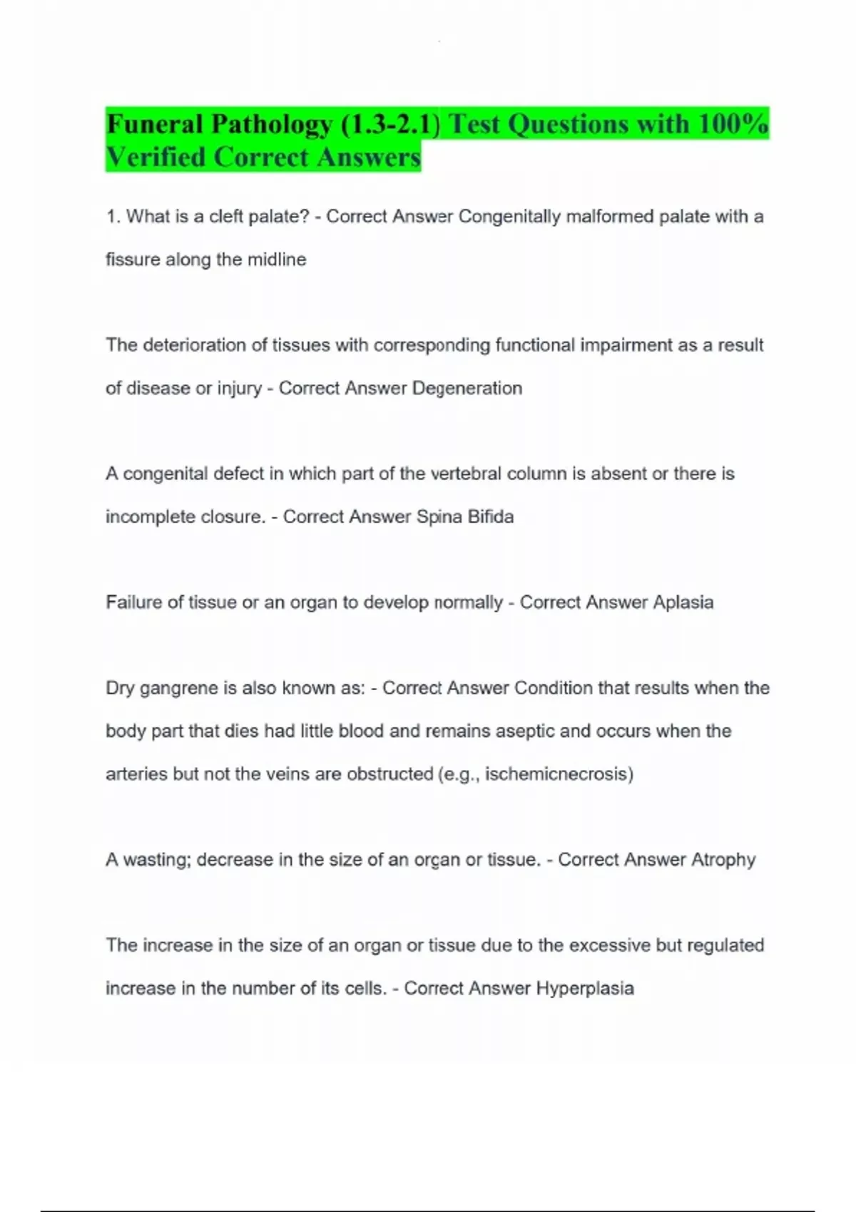 Funeral Pathology (1.3-2.1) Test Questions with 100% Verified Correct Answers 1. What is a cleft palate? - Correct Answer Congenitally malformed palate with a fissure along the midline The deterioration of tissues with corresponding functional impairment as a result of disease or injury - Correct Answer Degeneration A congenital defect in which part of the vertebral column is absent or there is incomplete closure. - Correct Answer Spina Bifida Failure of tissue or an organ to develop normally - Correct Answer Aplasia Dry gangrene is also known as: - Correct Answer Condition that results when the body part that dies had little blood and remains aseptic and occurs when the arteries but not the veins are obstructed (e.g., ischemicnecrosis) A wasting; decrease in the size of an organ or tissue. - Correct Answer Atrophy The increase in the size of an organ or tissue due to the excessive but regulated increase in the number of its cells. - Correct Answer Hyperplasia What is polydactylism? - Correct Answer extra fingers or toes Describe cellular swelling. - Correct Answer (cellular edema) is an acute reversible change resulting as a response to nonlethal injuries. Give an example of pathological atrophy