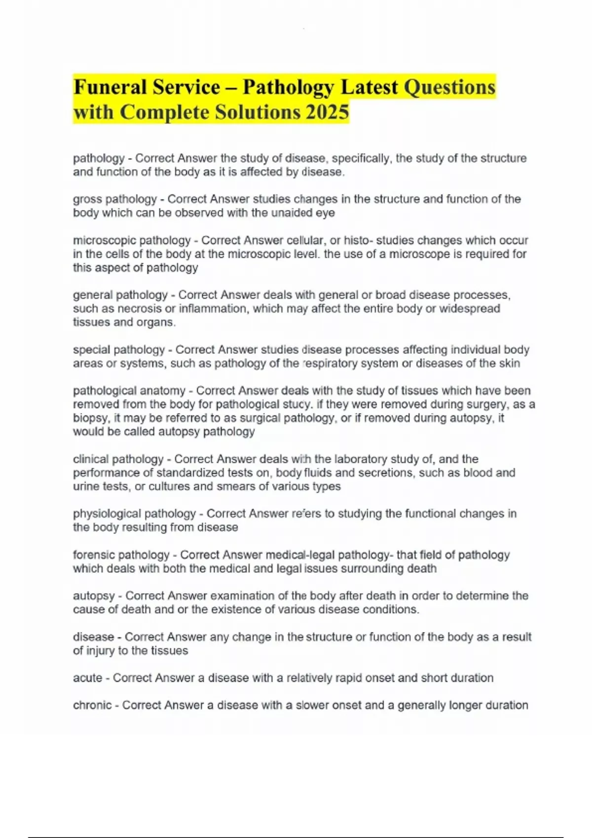 Funeral Service – Pathology Latest Questions with Complete Solutions 2025 pathology - Correct Answer the study of disease, specifically, the study of the structure and function of the body as it is affected by disease. gross pathology - Correct Answer studies changes in the structure and function of the body which can be observed with the unaided eye microscopic pathology - Correct Answer cellular, or histo- studies changes which occur in the cells of the body at the microscopic level. the use of a microscope is required for this aspect of pathology general pathology - Correct Answer deals with general or broad disease processes, such as necrosis or inflammation, which may affect the entire body or widespread tissues and organs. special pathology - Correct Answer studies disease processes affecting individual body areas or systems, such as pathology of the respiratory system or diseases of the skin pathological anatomy - Correct Answer deals with the study of tissues which have been removed from the body for pathological study. if they were removed during surgery, as a biopsy, it may be referred to as surgical pathology, or if removed during autopsy, it would be called autopsy pathology clinical pathology - Correct Answer deals with the laboratory study of, and the performance of standardized tests on, body fluids and secretions, such as blood and urine tests, or cultures and smears of various types physiological pathology - Correct Answer refers to studying the functional changes in the body resulting from disease forensic pathology - Correct Answer medical-legal pathology- that field of pathology which deals with both the medical and legal issues surrounding death autopsy - Correct Answer examination of the body after death in order to determine the cause of death and or the existence of various disease conditions. disease - Correct Answer any change in the structure or function of the body as a result of injury to the tissues acute - Correct Answer a disease with a relatively rapid onset and short duration chronic - Correct Answer a disease with a slower onset and a generally longer duration fulminating - Correct Answer an acute disease which is particularly severe and sudden in its onset, and often proves fatal recurrent - Correct Answer diseases which show alternating increases and decreases in their symptoms infectious - Correct Answer diseases that are caused by pathogenic microorganisms contagious - Correct Answer diseases which are easily transmitted from person to person infestation - Correct Answer the presence of macroscopic organisms in or on the body, such as animal parasites idiopathic - Correct Answer a disease for which the cause is unknown