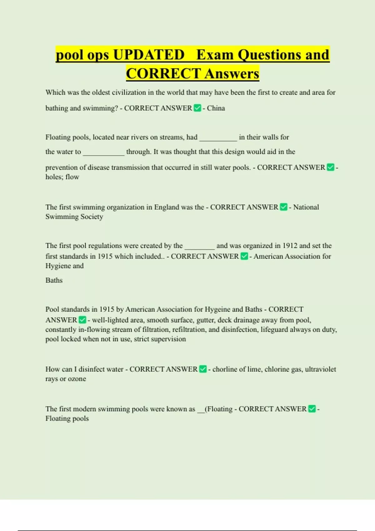 pool ops UPDATED Exam Questions and CORRECT Answers Which was the oldest civilization in the world that may have been the first to create and area for bathing and swimming? - CORRECT ANSWER - China Floating pools, located near rivers on streams, had __________ in their walls for the water to ___________ through. It was thought that this design would aid in the prevention of disease transmission that occurred in still water pools. - CORRECT ANSWER holes; flo