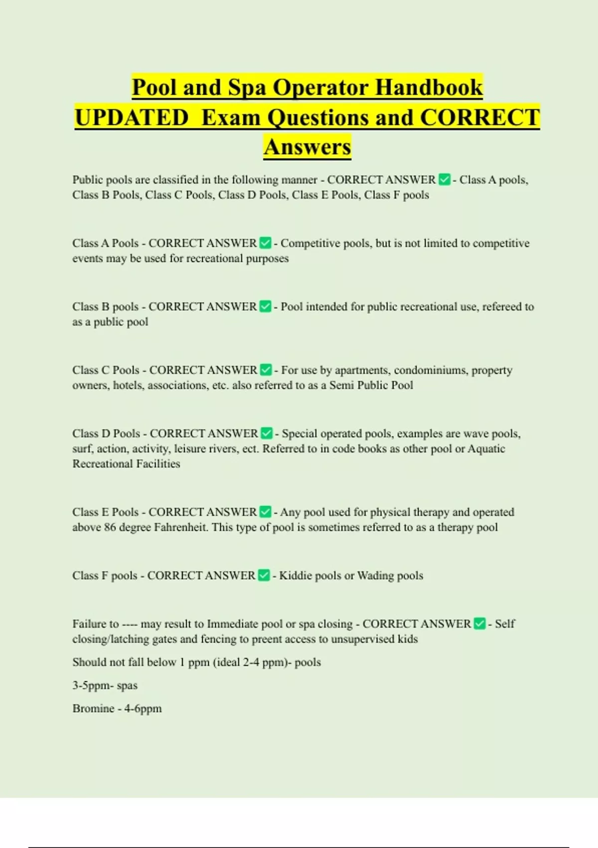 Public pools are classified in the following manner - CORRECT ANSWER - Class A pools,