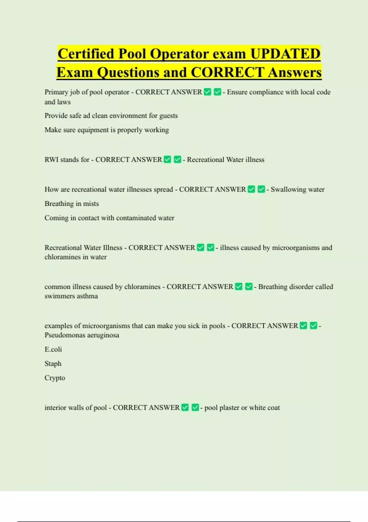 Certified Pool Operator exam UPDATED Exam Questions and CORRECT Answers Primary job of pool operator - CORRECT ANSWER and laws Provide safe ad clean environment for guests Make sure equipment is properly working RWI stands for - CORRECT ANSWER - Ensure compliance with local code - Recreational Water illness