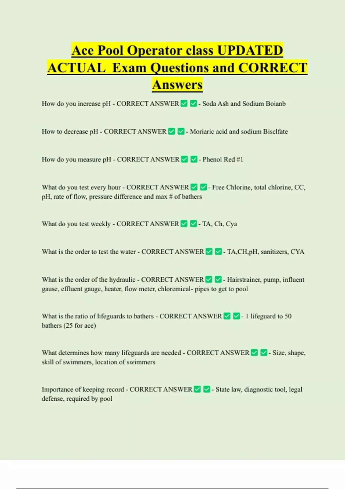 Ace Pool Operator class UPDATED ACTUAL Exam Questions and CORRECT Answers How do you increase pH - CORRECT ANSWER How to decrease pH - CORRECT ANSWER How do you measure pH - CORRECT ANSWER What do you test every hour - CORRECT ANSWER - Soda Ash and Sodium Boianb - Moriaric acid and sodium Bisclfate - Phenol Red #1