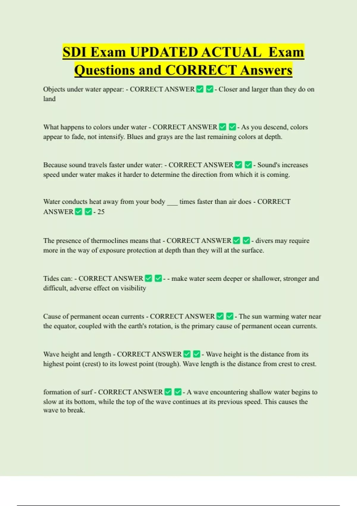 SDI Exam UPDATED ACTUAL Exam Questions and CORRECT Answers Objects under water appear: - CORRECT ANSWER land - Closer and larger than they do on What happens to colors under water - CORRECT ANSWER - As you descend, colors appear to fade, not intensify. Blues and grays are the last remaining colors at dep