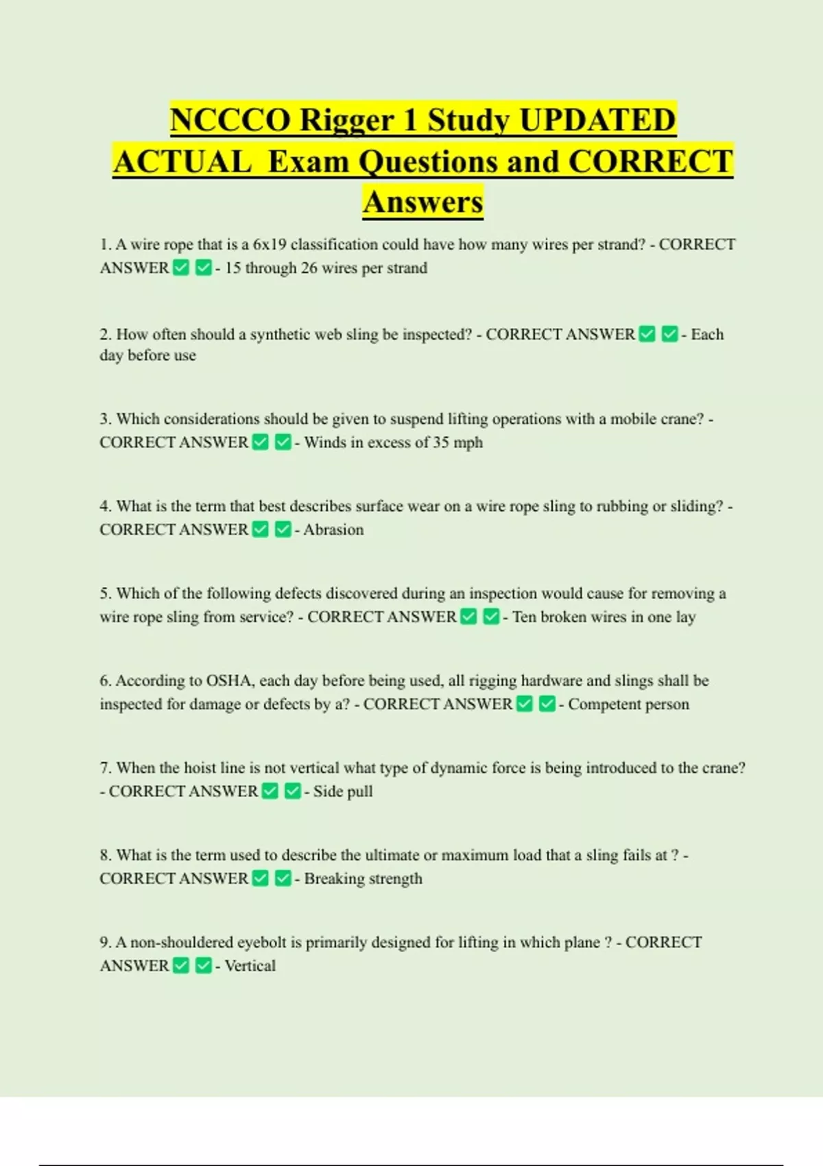 NCCCO Rigger 1 Study UPDATED ACTUAL Exam Questions and CORRECT Answers 1. A wire rope that is a 6x19 classification could have how many wires per strand? - CORRECT ANSWER - 15 through 26 wires per strand 2. How often should a synthetic web sling be inspected? - CORRECT ANSWER day before use