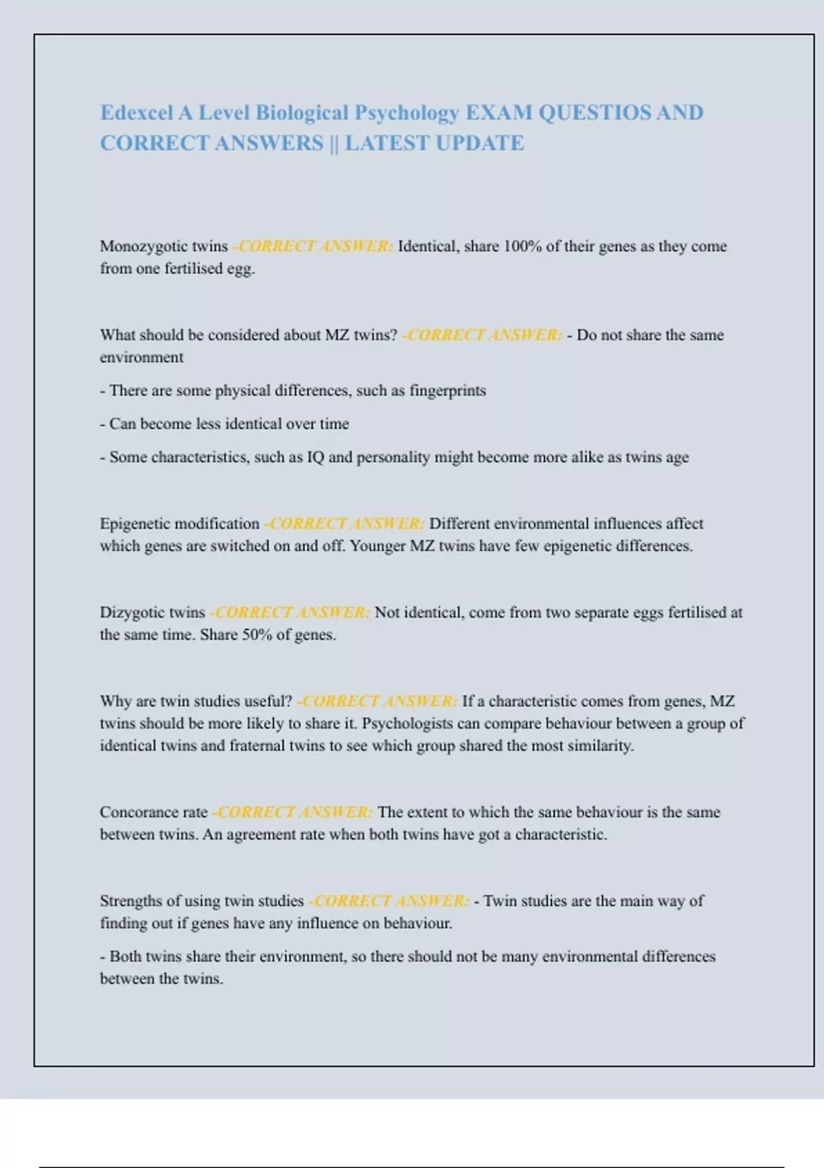 ,Weaknesses of using twin studies -CORRECT ANSWER: - MZ twins will be treated more like