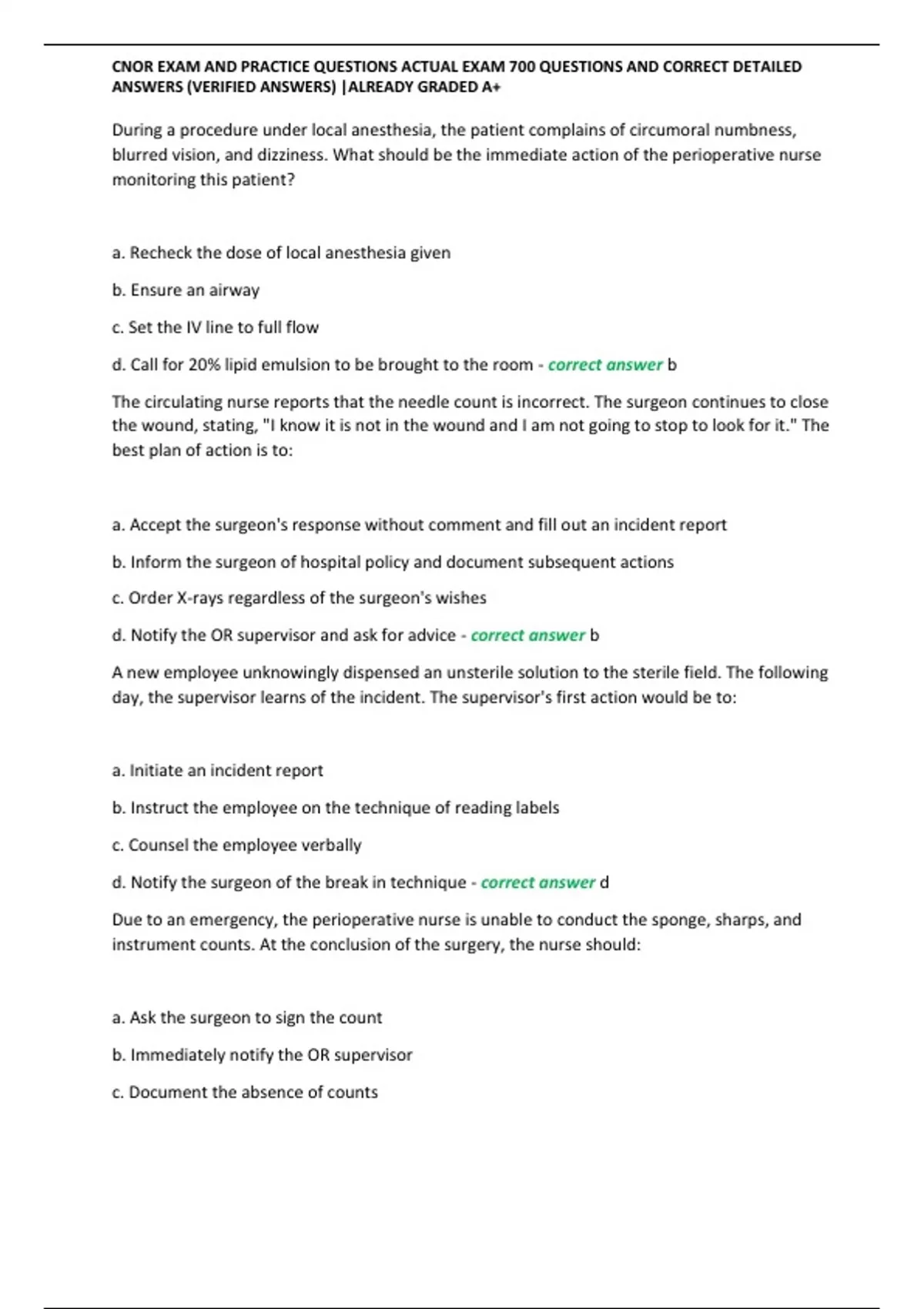 , CNOR EXAM AND PRACTICE QUESTIONS ACTUAL EXAM 700 QUESTIONS AND CORRECT DETAILED