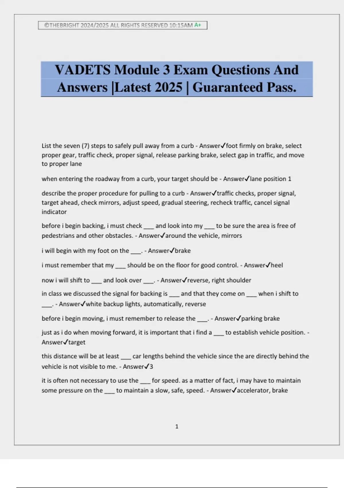 ©THEBRIGHT 2024/2025 ALL RIGHTS RESERVED 10:15AM A+ 1 VADETS Module 3 Exam Questions And Answers |Latest 2025 | Guaranteed Pass. List the seven (7) steps to safely pull away from a curb - Answerfoot firmly on brake, select proper gear, traffic check, proper signal, release parking brake, select gap in traffic, and move to proper lane when entering the roadway from a curb, your target should be - Answerlane position 1 describe the proper procedure for pulling to a curb - Answertraffic checks, proper signal, target ahead, check mirrors, adjust speed, gradual steering, recheck traffic, cancel signal indicator before i begin backing, i must check ___ and look into my ___ to be sure the area is free of pedestrians and other obstacles. - Answeraround the vehicle, mirrors i will begin with my foot on the ___. - Answerbrake i must remember that my ___ should be on the floor for good control. - Answerheel now i will shift to ___ and look over ___. - Answerreverse, right shoulder in class we discussed the signal for backing is ___ and that they come on ___ when i shift to ___. - Answerwhite backup lights, automatically, reverse before i begin moving, i must remember to release the ___. - Answerparking brake just as i do when moving forward, it is important that i find a ___ to establish vehicle position. - Answertarget this distance will be at least ___ car lengths behind the vehicle since the are directly behind the vehicle is not visible to me. - Answe