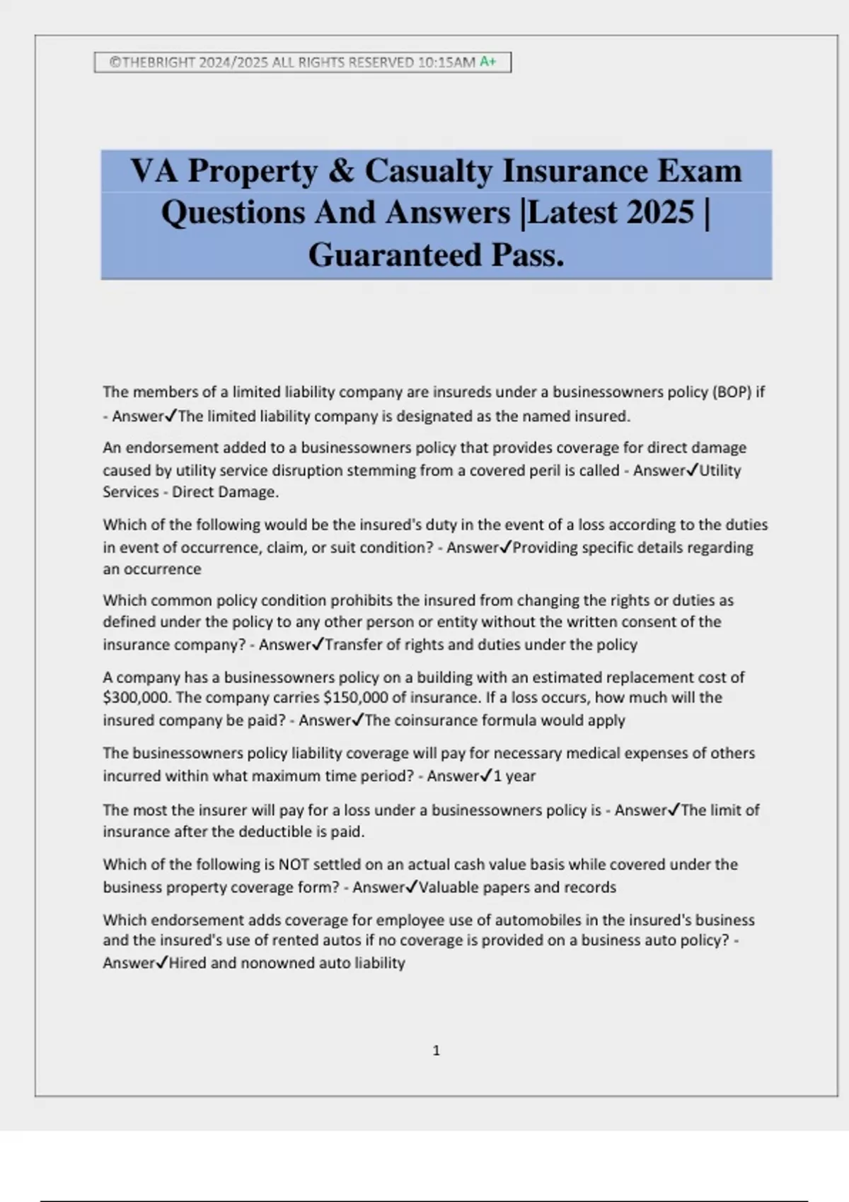 VA Property & Casualty Insurance Exam