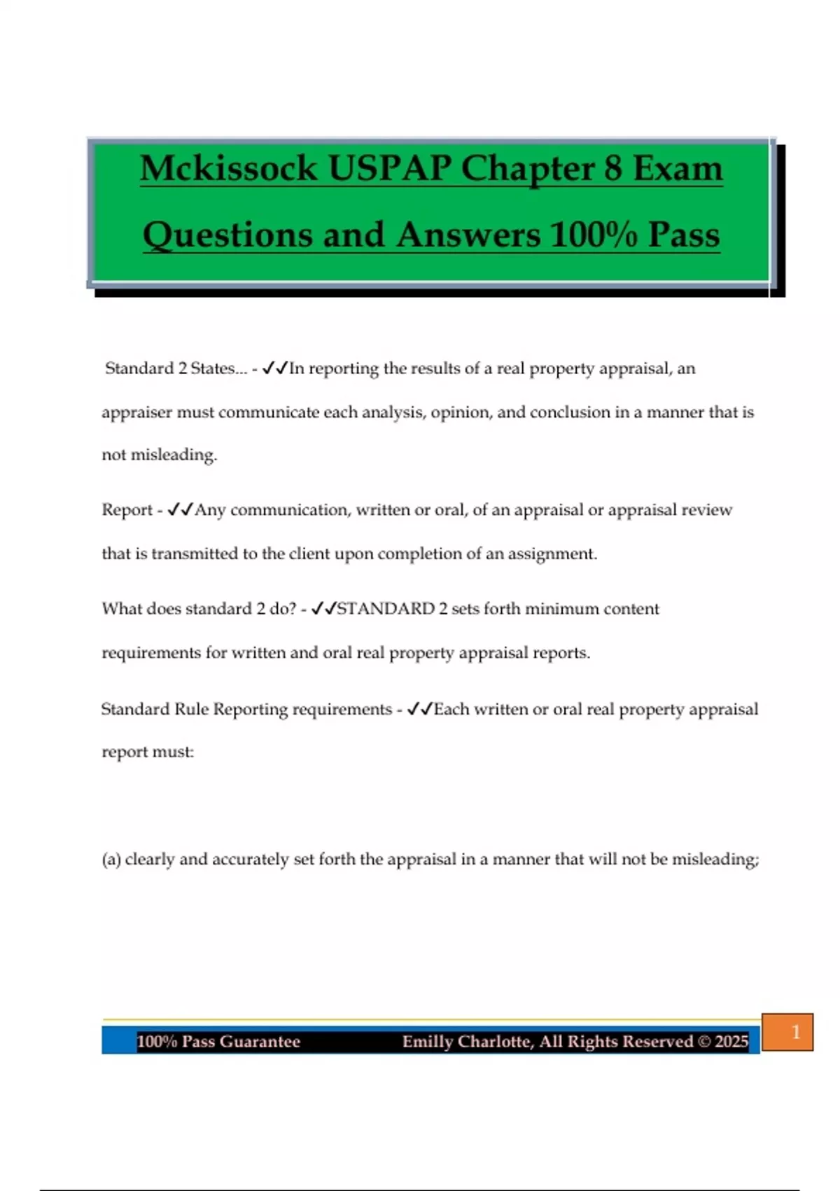 Mckissock USPAP Chapter 8 Exam Questions and Answers 100% Pass Standard 2 States... - In reporting the results of a real property appraisal, an appraiser must communicate each analysis, opinion, and conclusion in a manner that is not misleading. Report - Any communication, written or oral, of an appraisal or appraisal review that is transmitted to the client upon completion of an assignment. What does standard 2 do? - STANDARD 2 sets forth minimum content requirements for written and oral real property appraisal reports. Standard Rule Reporting requirements - Each written or oral real property appraisal report must: (a) clearly and accurately set forth the appraisal in a manner that will not be misleading; 2100% Pass Guarantee Emilly Charlotte, All Rights Reserved © 2025 (b) contain sufficient information to enable the intended users of the appraisal to understand the report properly; and (c) clearly and accurately disclose all assumptions, extraordinary assumptions, hypothetical conditions, and limiting conditions used in the assignment Sufficient information Requirement - The appraiser is not required to include sufficient information so that anyone other than intended users can understand the report. Standard Rule 2-2 - Each written real property appraisal report