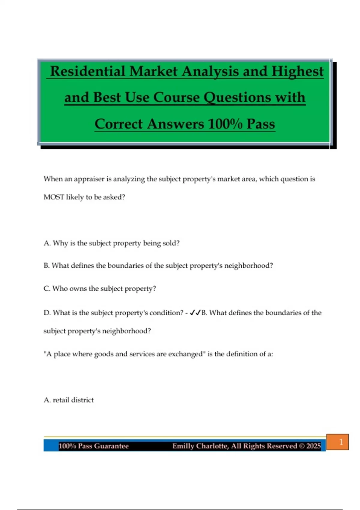 Residential Market Analysis and Highest and Best Use Course Questions with Correct Answers 100% Pass When an appraiser is analyzing the subject property's market area, which question is MOST likely to be asked? A. Why is the subject property being sold? B. What defines the boundaries of the subject property's neighborhood? C. Who owns the subject property? D. What is the subject property's condition? - B. What defines the boundaries of the subject property's neighborhood? "A place where goods and services are exchanged" is the definition of a: A. retail district 2100% Pass Guarantee Emilly Charlotte, All Rights Reserved © 2025 B. market C. neighborhood D. store - B. market True or False: The appraisal profession has its own fundamental terminology, just like the medical and legal professions. - True When an appraiser is analyzing the subject property's market area, which question is LEAST likely to be asked? A. Where is the property located? B. What defines the boundaries of the property's neighborhood? C. Who owns the property? D. What are the trends for this neighborhood? - C. Who owns the property? A study of the market as a whole, as well as the investigation of conditions of a component of that market, for a particular type of property, is the definition of: A. market value B. neighborhood 3100% Pass Guarantee Emilly Charlotte, All Rights Reserved © 2025 C. market analysis D. appraisal - C. market analysis The value of a fair quality home will be enhanced if it is located in a neighborhood of all good quality homes. What economic principle does this demonstrate? A. Substitution B. Progression C. Anticipation D. Regression - B. Progression If there are not enough homes available in a market to satisfy demand, what will happen to home prices? A. they will increase B. they will decrease C. they will stay the same - A. they will increase Which of these is an example of the principle of progression? 4100% Pass Guarantee Emilly Charlotte, All Rights Reserved © 2025 A. Average quality home in average quality neighborhood B. A manufacturing facility located in a residential neighborhood C. A good quality home in a neighborhood of average quality homes D. Fair quality home in a neighborhood of good quality homes - D. Fair quality home in a neighborhood of good quality homes Which stage of the life cycle does not happen in every neighborhood or property? A. Decline B. Renewal C. Growth D. Stability - B. Renewal What is another name for the principle of inclining and declining periods? A. ups and downs B. Externalities C. Anticipation D. Integration and Disintegration - D. Integration and Disin